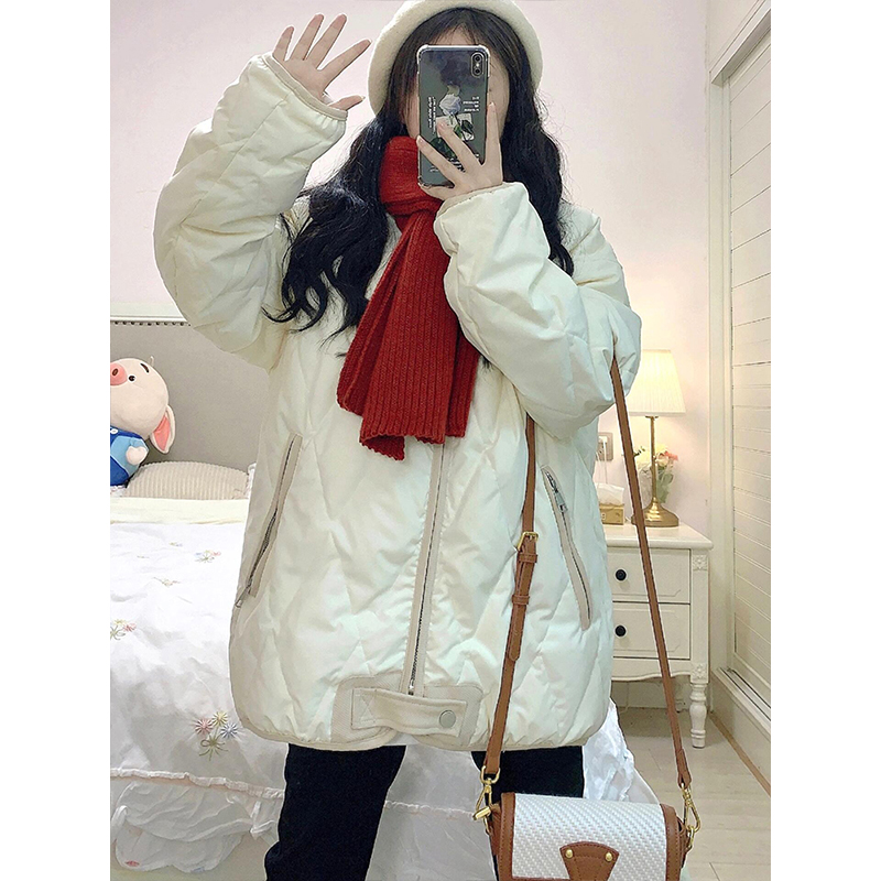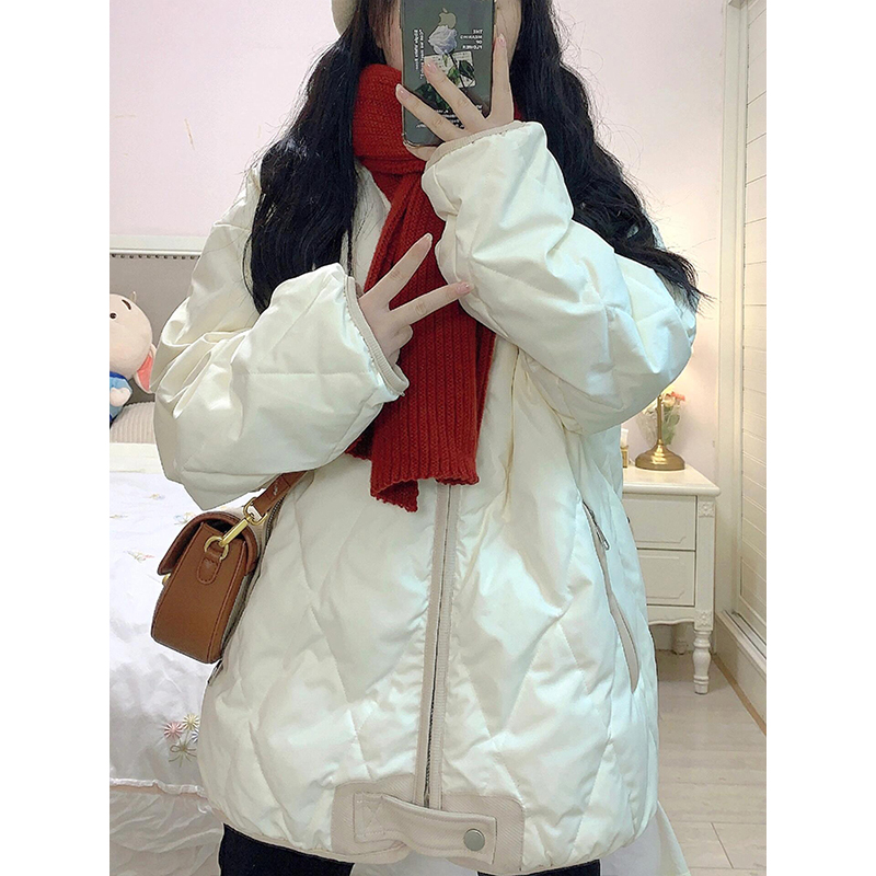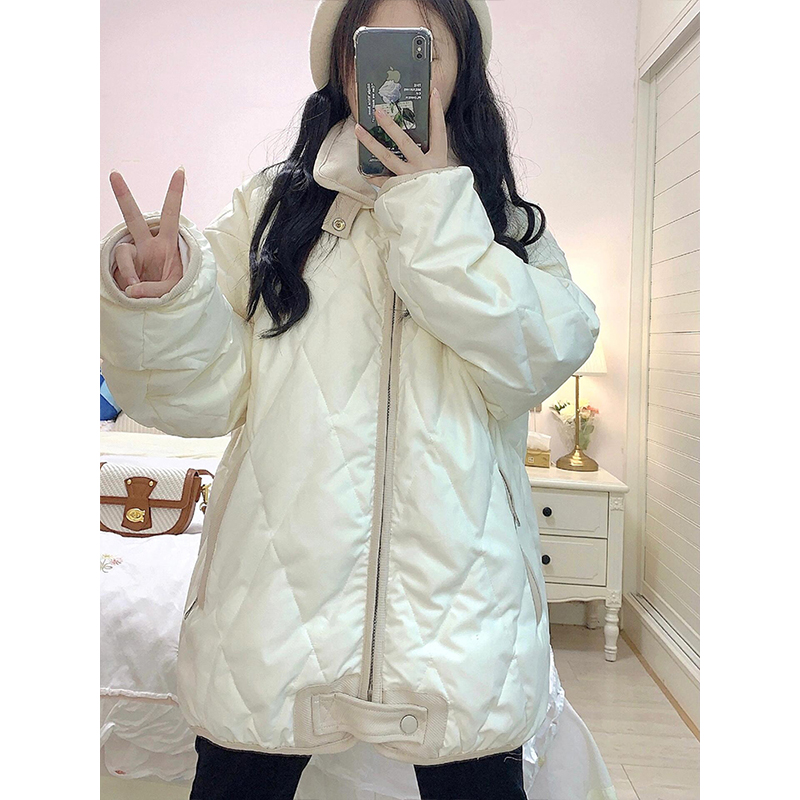 大码女装胖mm米白色菱格羽绒棉服女冬季学院风加厚学生面包服外套