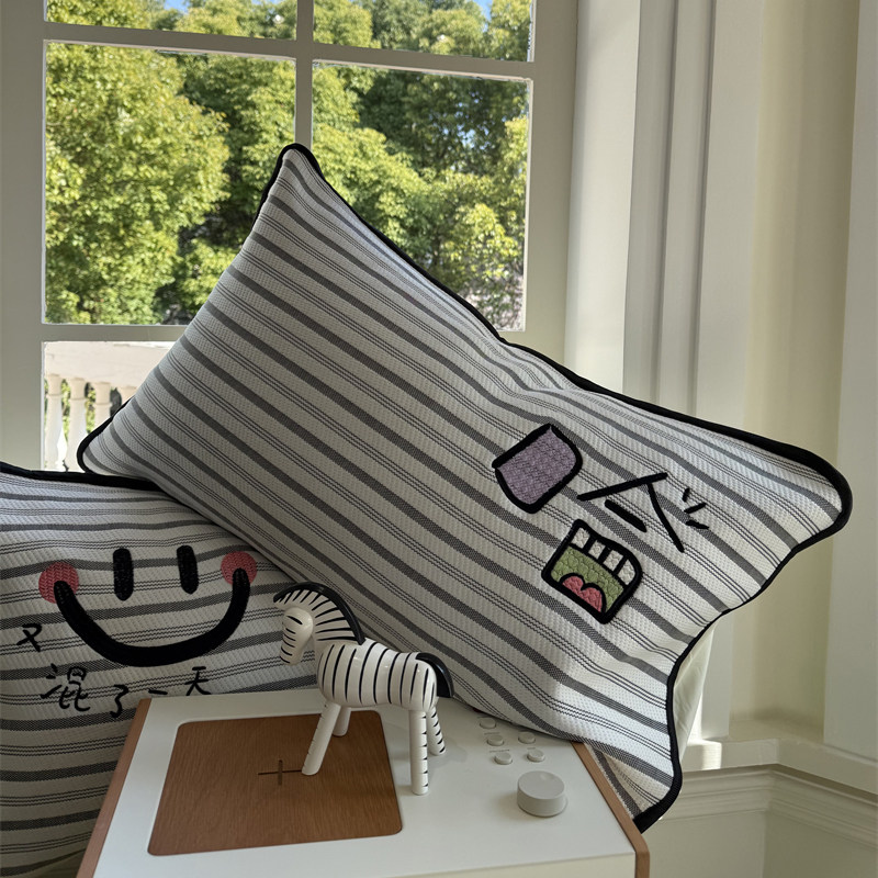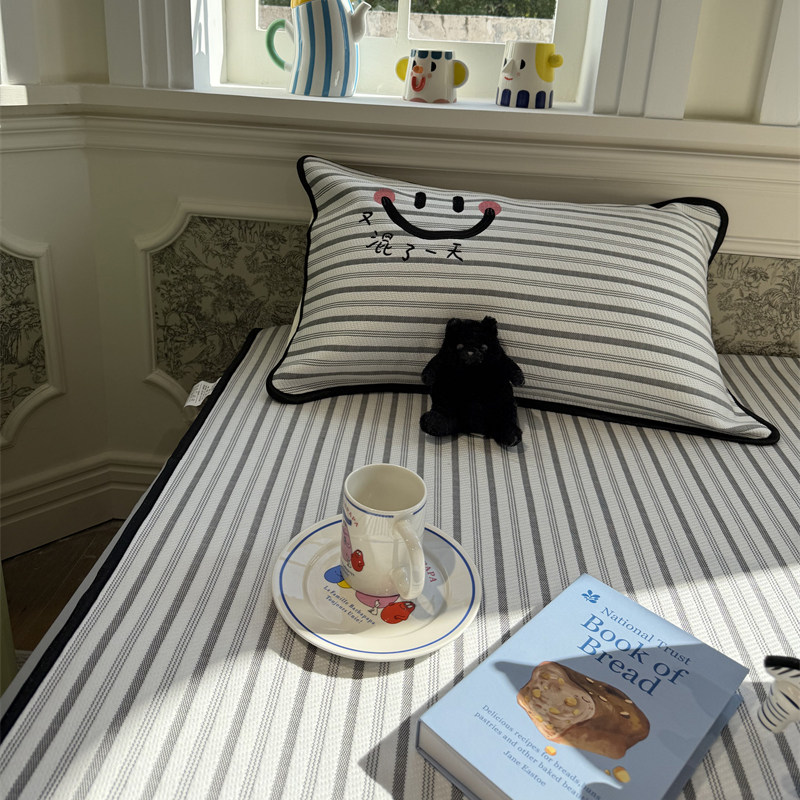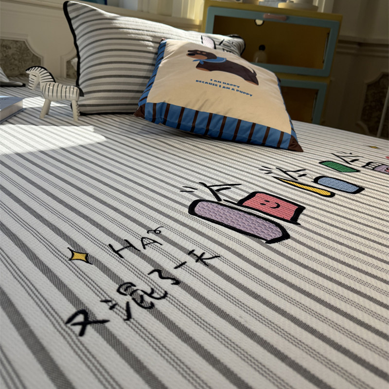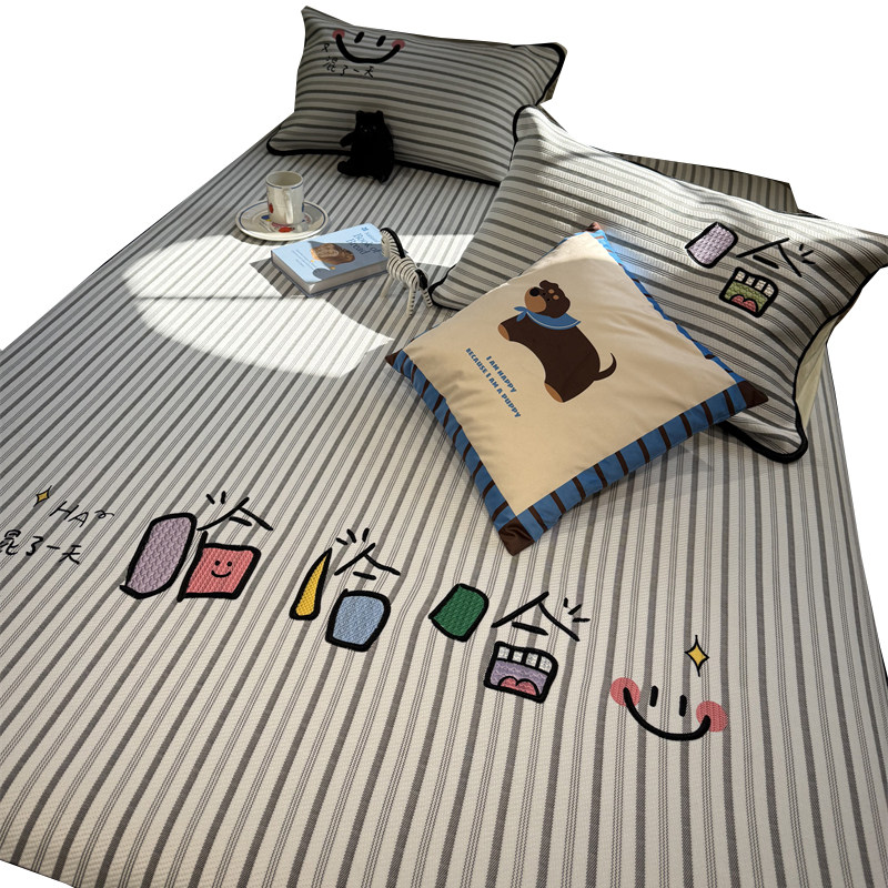 ins风简约刺绣搞怪条纹冰丝夏凉席床笠三件套1.5m1.8米空调席夏天