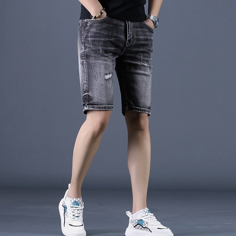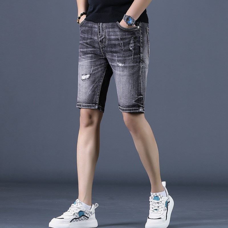 高端破洞牛仔短裤男士五分裤2025夏季新款潮牌黑色洗水修身中裤潮