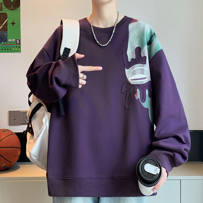 2025秋季新款青少年落肩袖圆领卫衣港风贴布印花潮牌男生百搭上衣