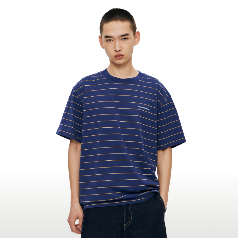 WassupHouse条纹刺绣短袖t恤男美式复古宽松撞色纯棉情侣上衣吸湿