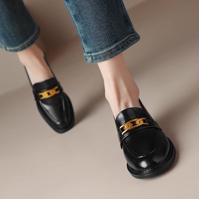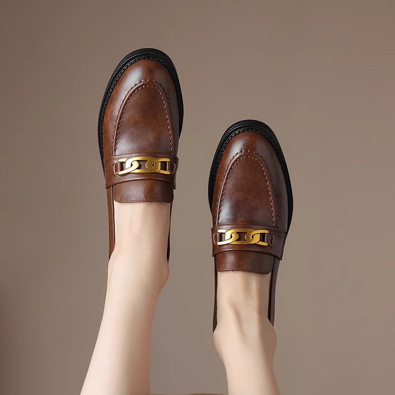 青蕴英伦风真皮加绒乐福鞋女秋冬款金属扣圆头小皮鞋复古粗跟单鞋