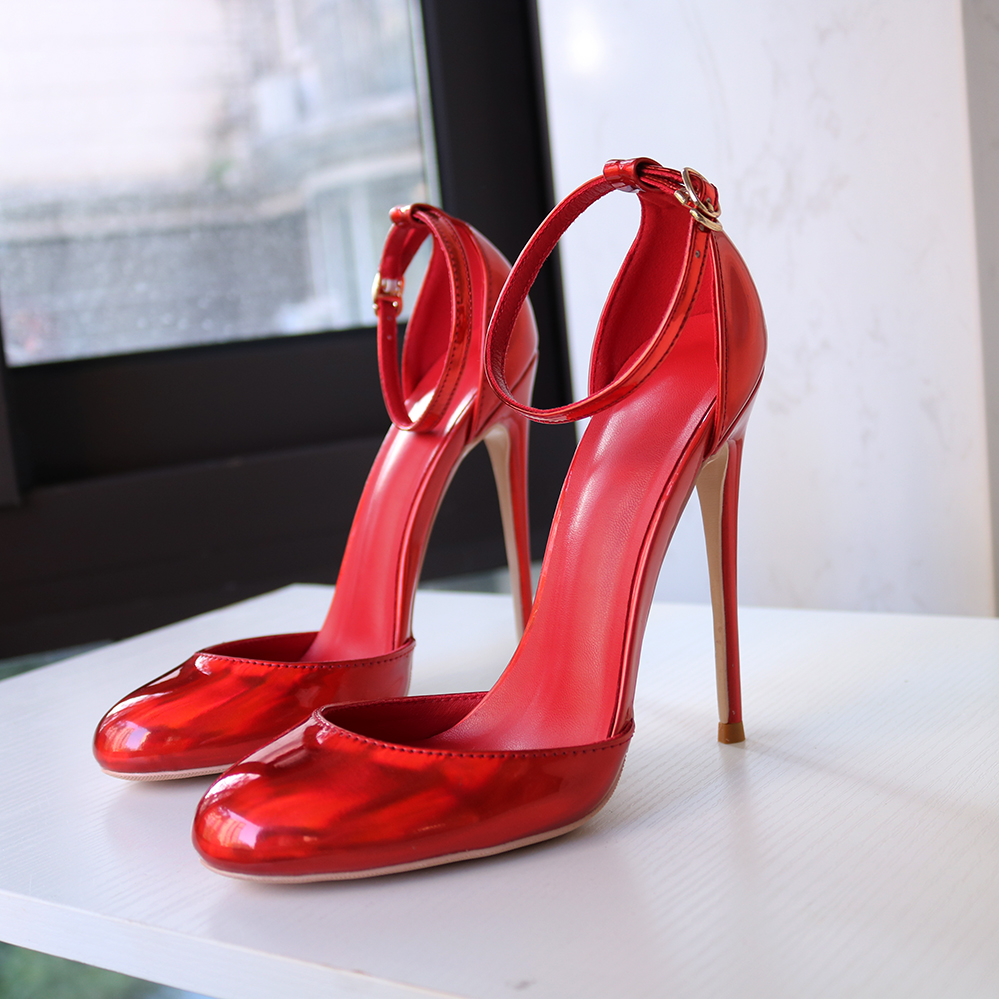 红色镭射一字带扣圆头高跟凉鞋超浅口性感CD大码13CM电光漆皮名媛