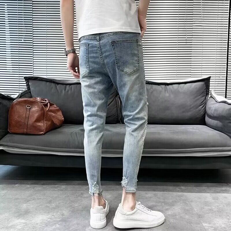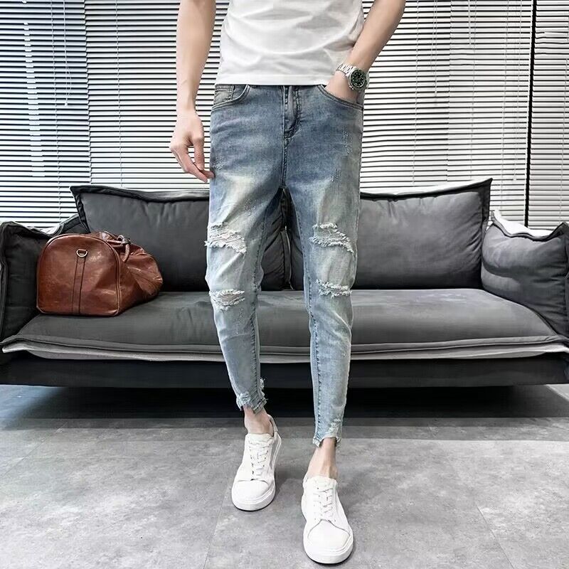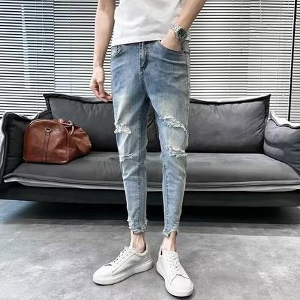 乞丐破洞小脚裤潮牌休闲百搭哈伦裤2023夏季新款男裤九分裤牛仔裤