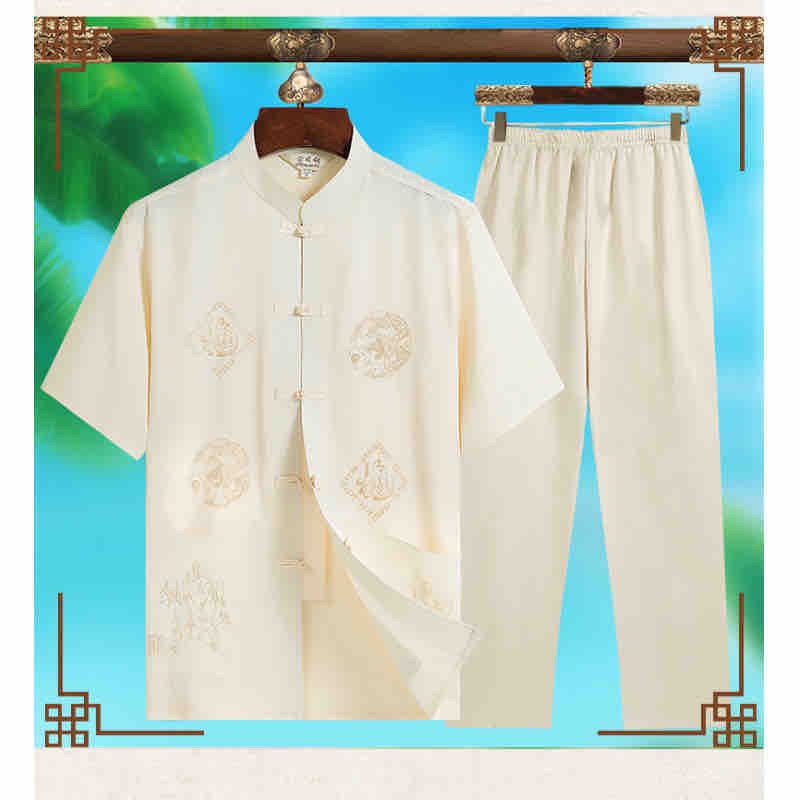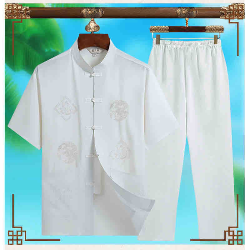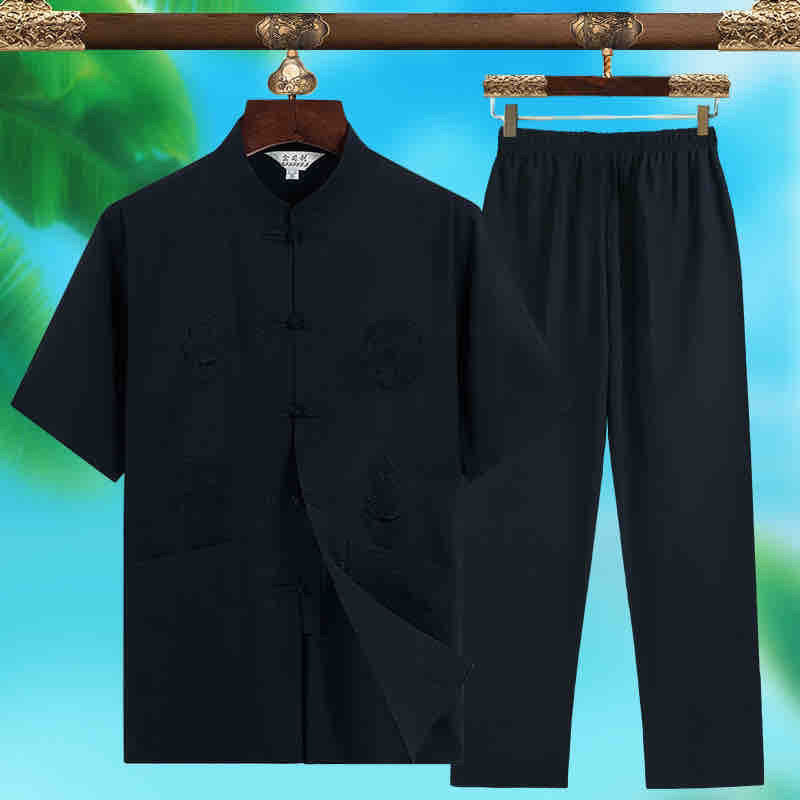 男士中国风唐装短袖汉服爷爷套装衬衫刺绣爸爸晨练年轻人夏季