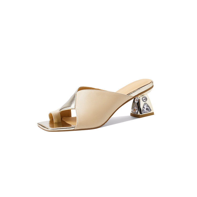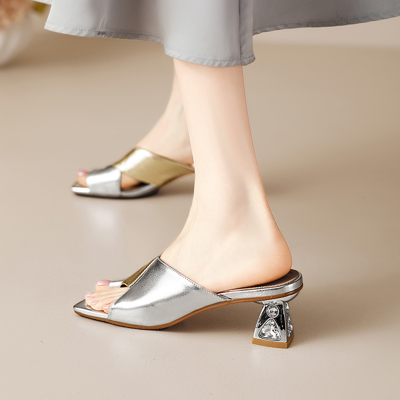 真皮一字拖女外穿2025夏新款粗跟拼色凉拖鞋套指水钻高跟凉鞋软皮