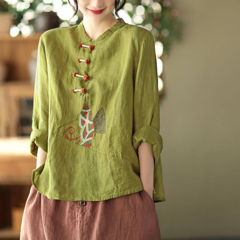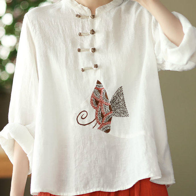 纯棉绣花上衣女2025春夏装民族风宽松大码盘扣文艺复古茶服衬衫女