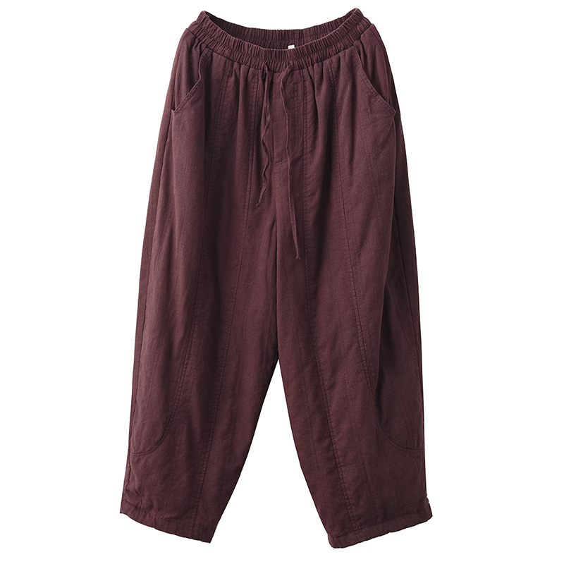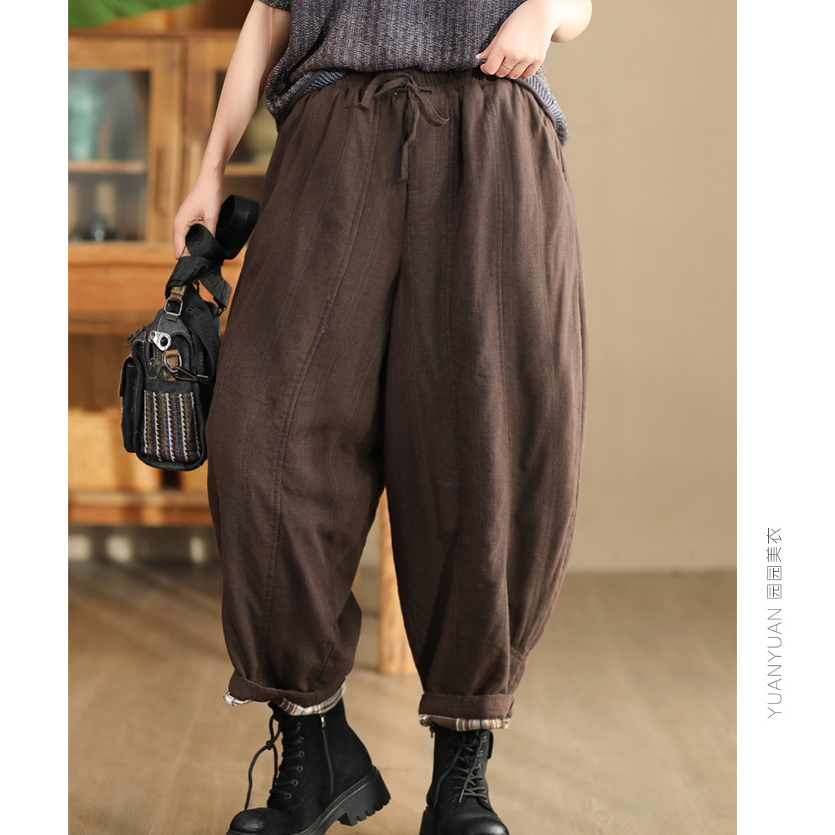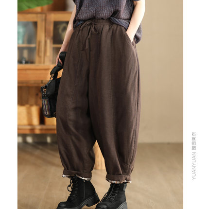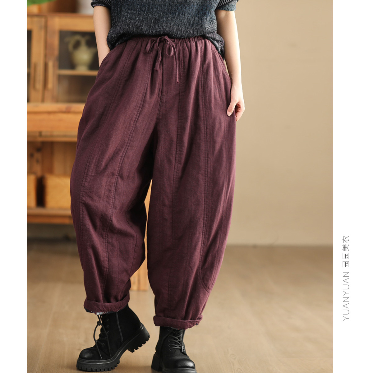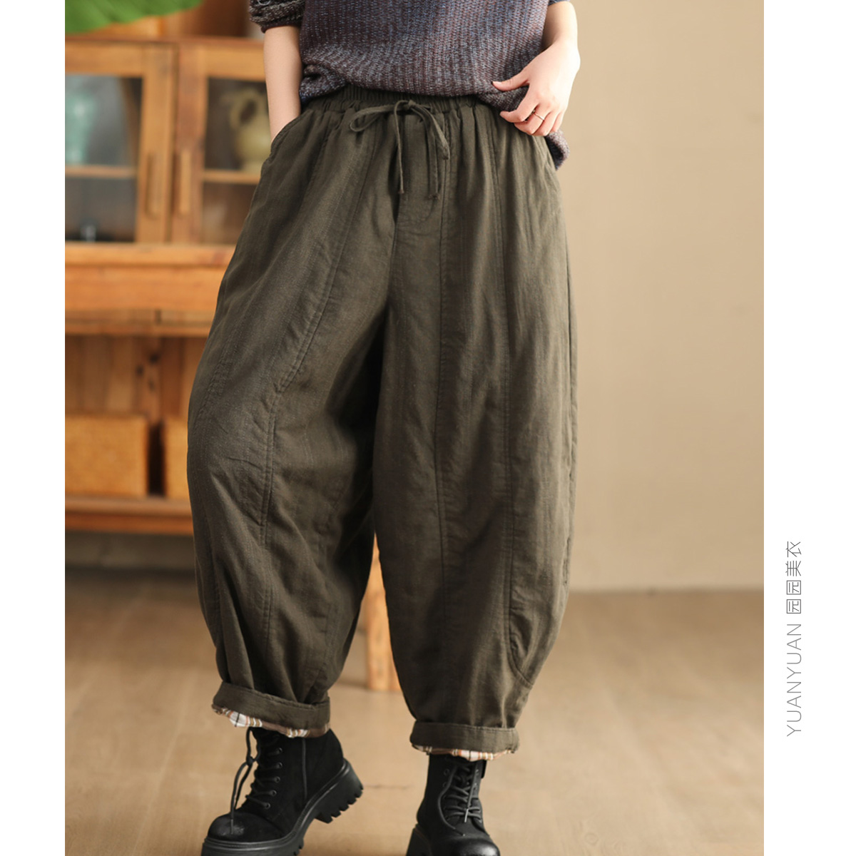 园园美衣冬季复古砂洗炒色汉麻夹棉裤内里色织格纹加厚棉裤保暖裤