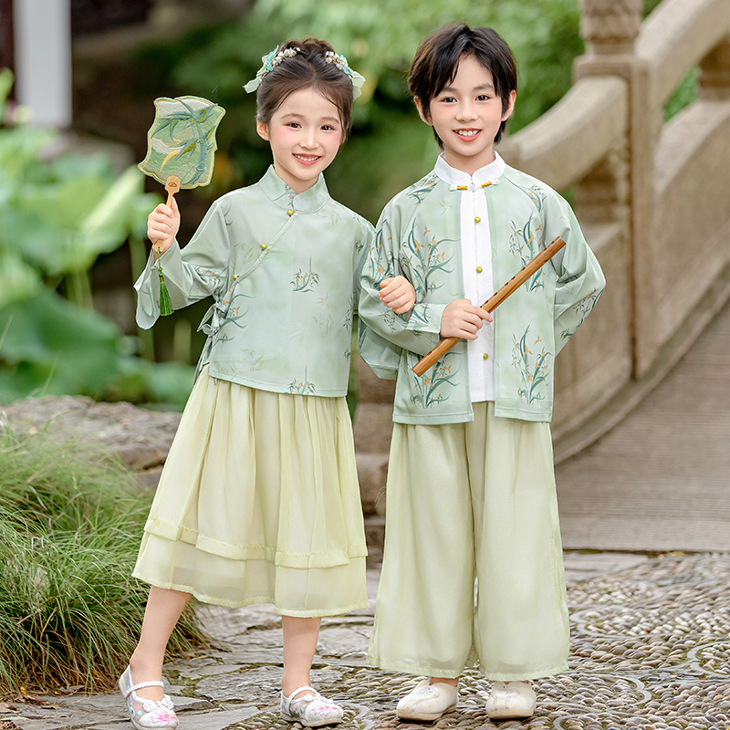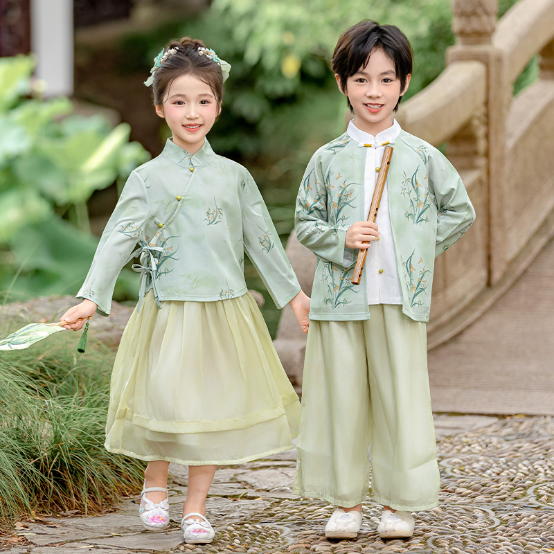 汉服男童国风长袖套装女童旗袍裙子两件套儿童唐装古风宝宝表演服