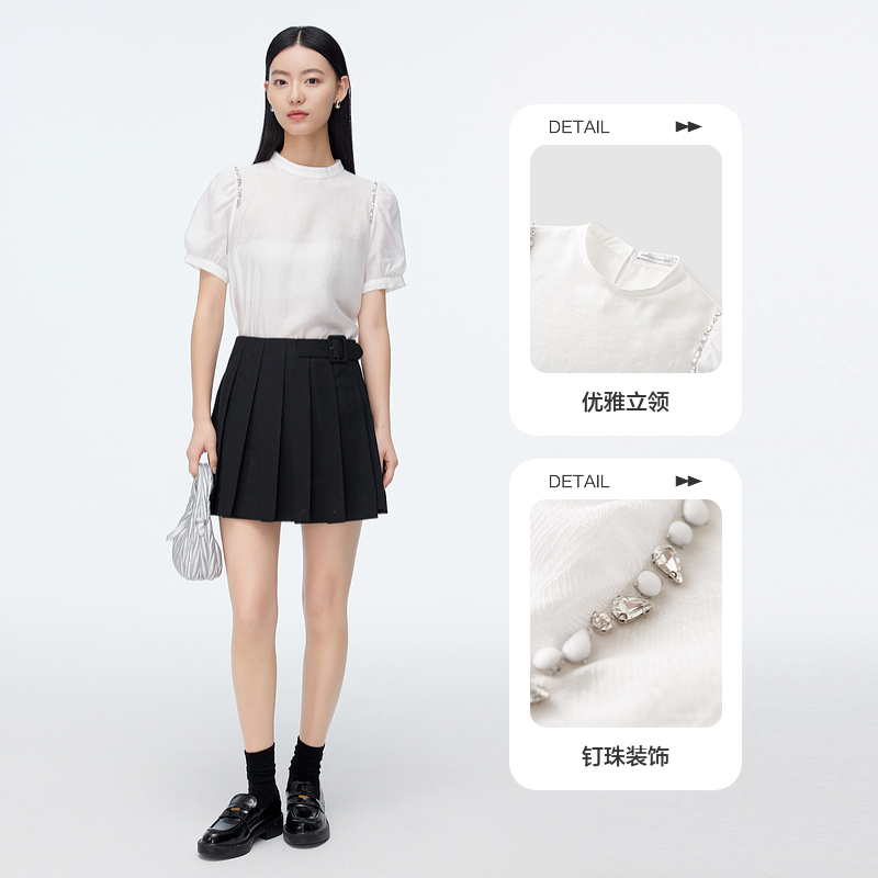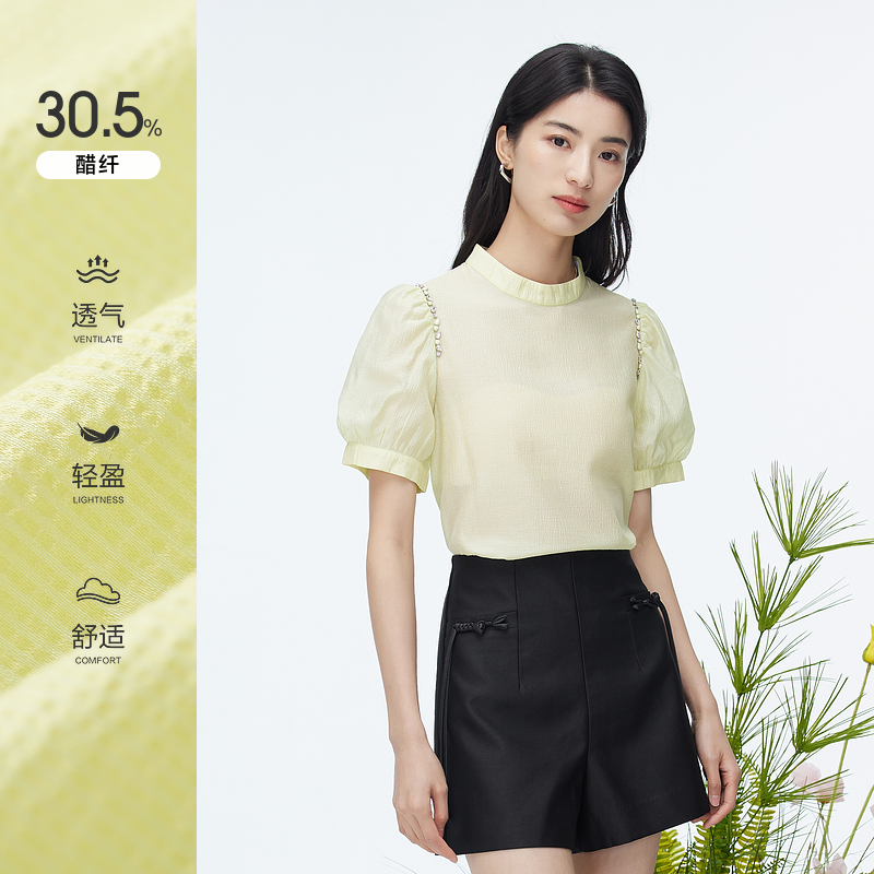 水云间天丝混纺短袖上衣女装夏季新款2025时尚通勤气质灯笼袖衬衣