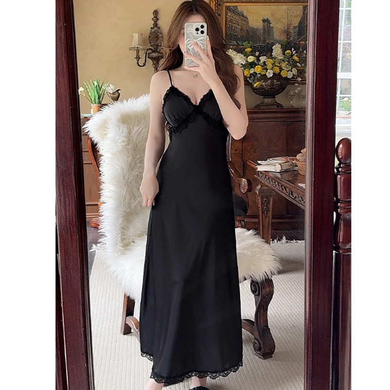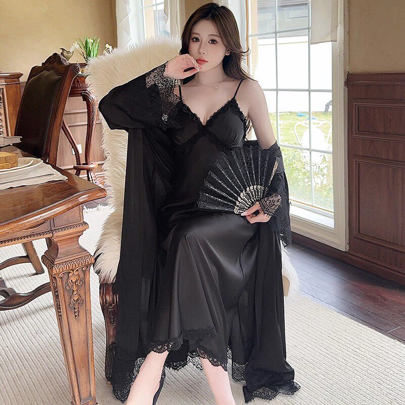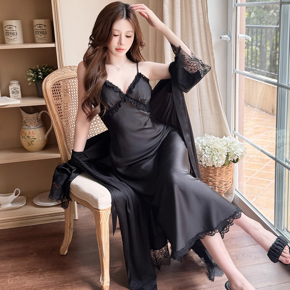 冰丝睡衣女款春秋长裙长袍两件套夏季性感蕾丝带胸垫吊带睡裙睡袍