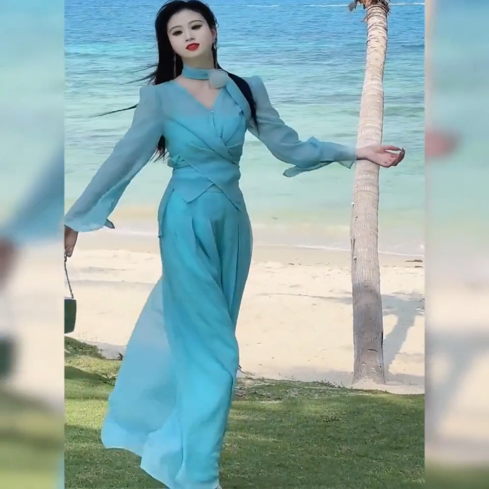 轻奢御姐范时尚两件套2025夏季新款交叉系带V领上衣+阔腿裤裙套装