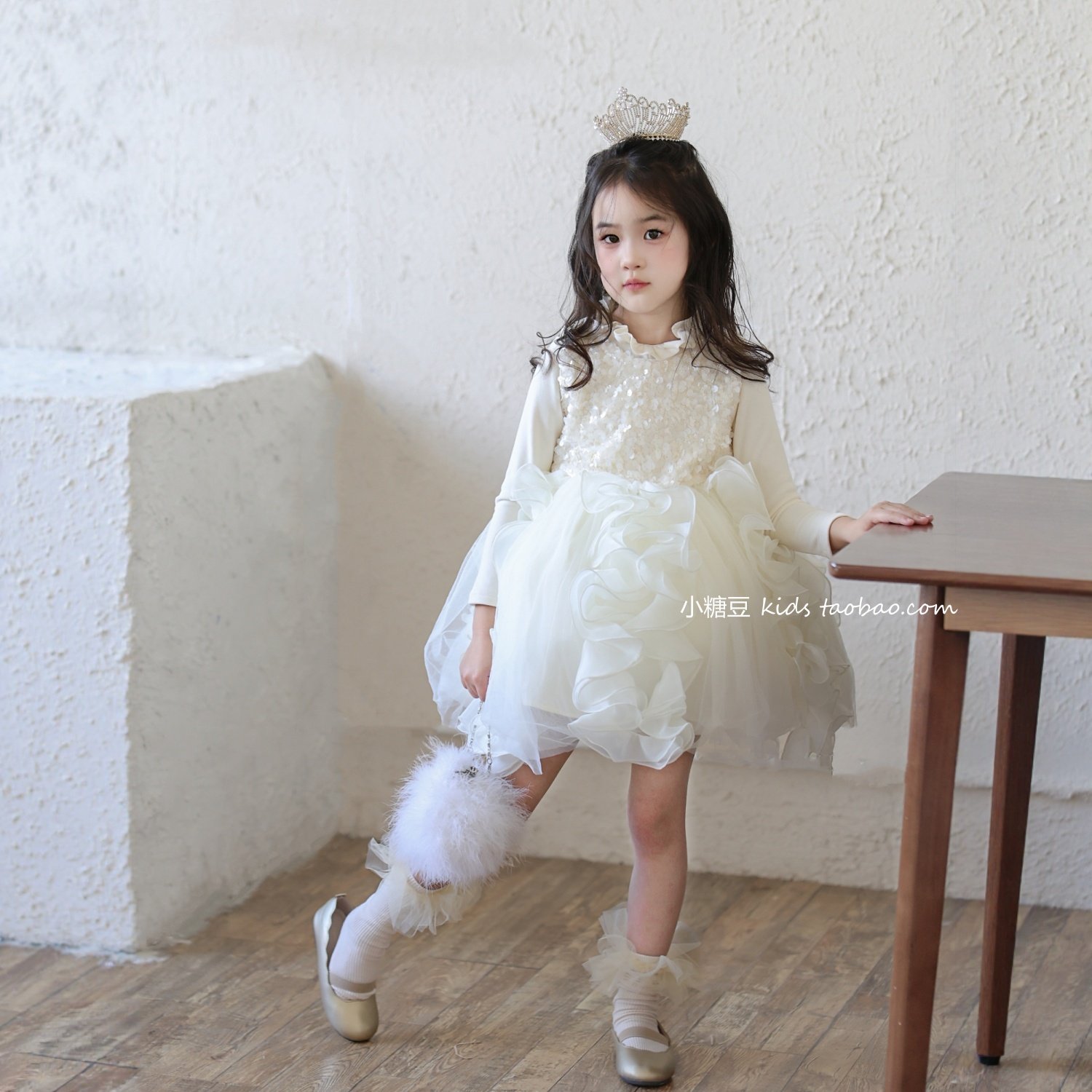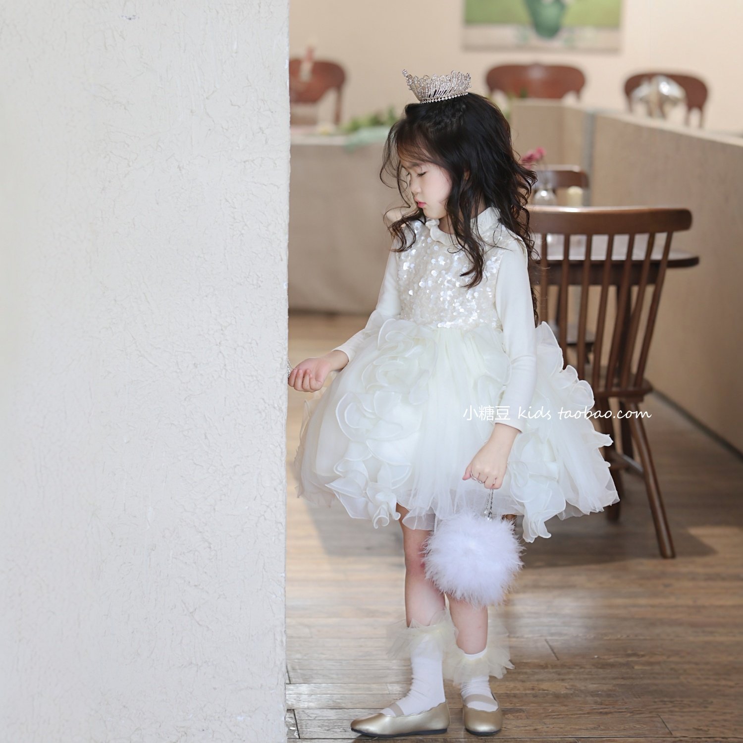 女童白色亮片网纱蛋糕裙连衣裙2025秋冬新款女孩蓬蓬公主裙背心裙