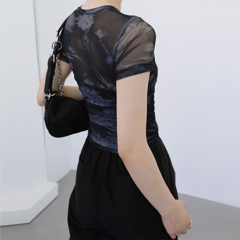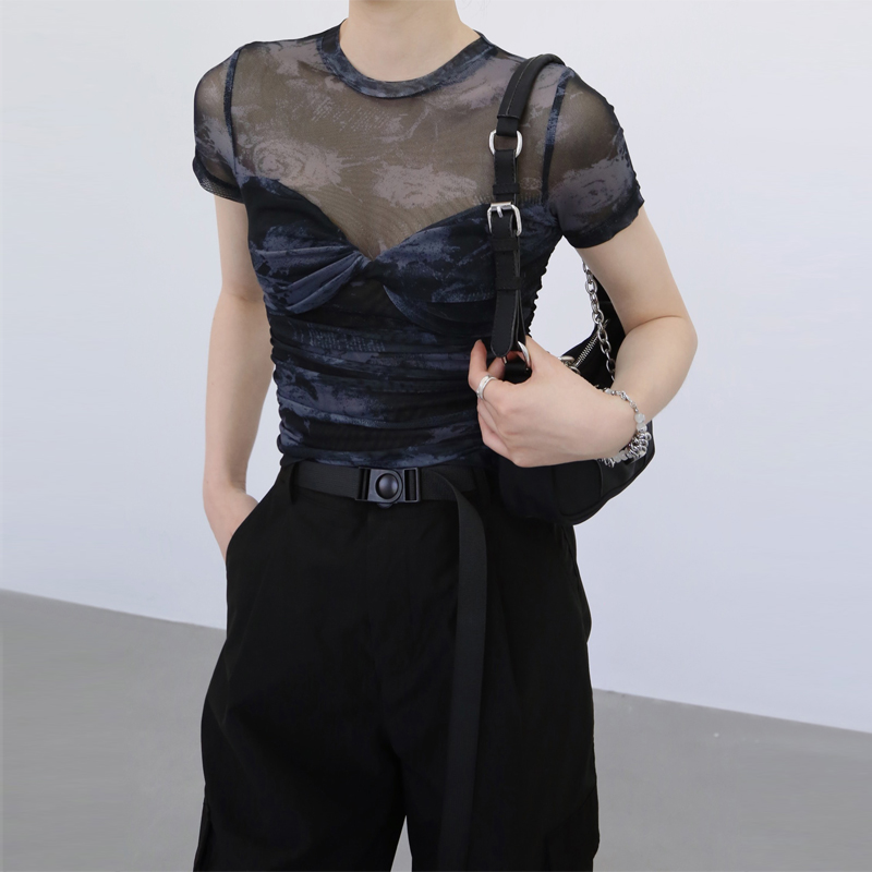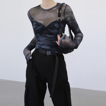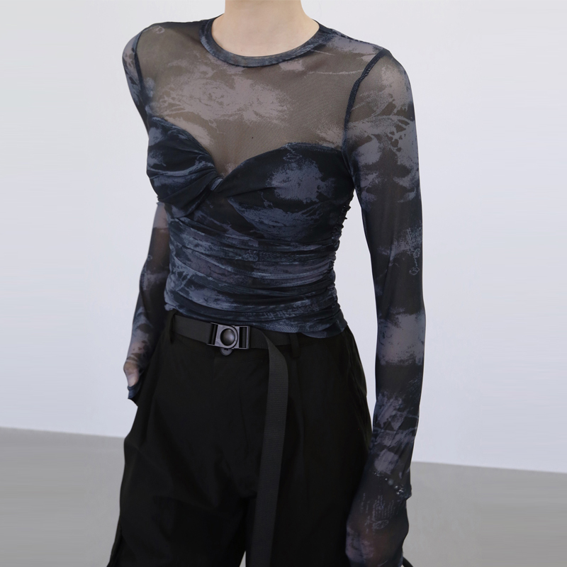 设计感上衣2025新款修身显瘦圆领印花t恤女长袖遮肉网纱打底衫