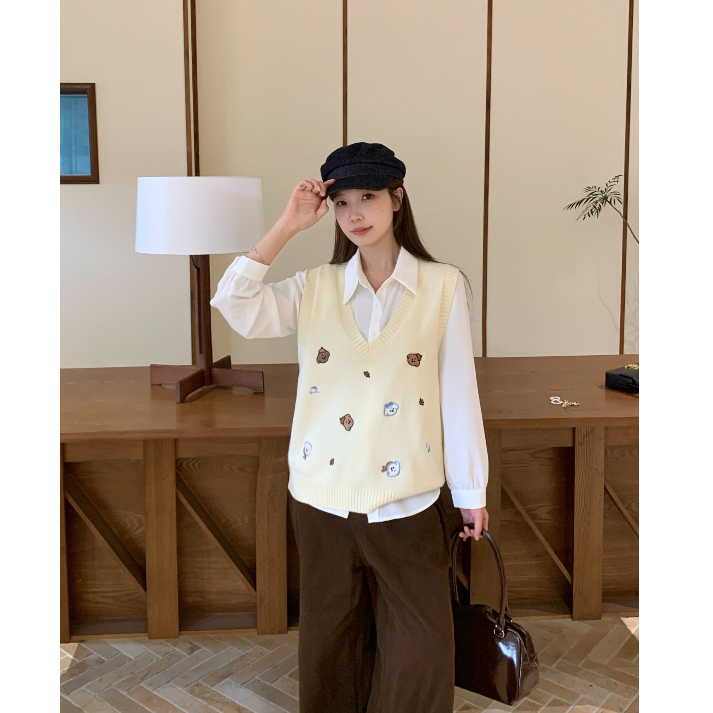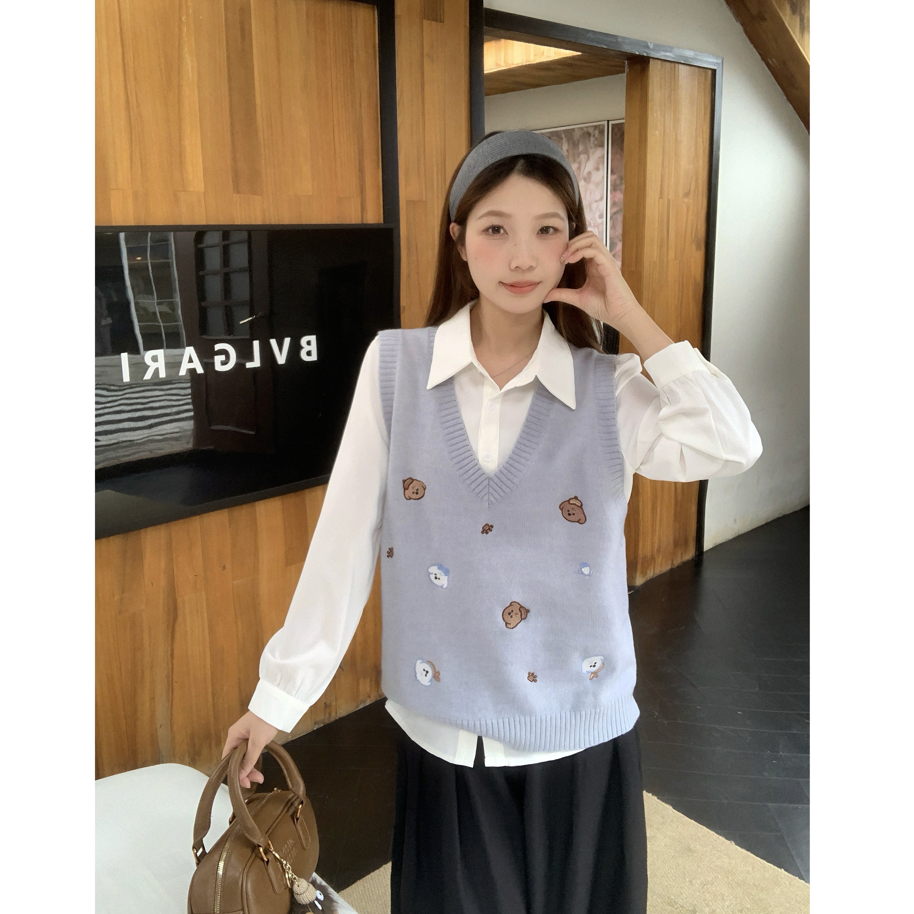 小吉家大码女装秋季胖mm刺绣卡通叠穿针织马甲背心打底衬衫两件套