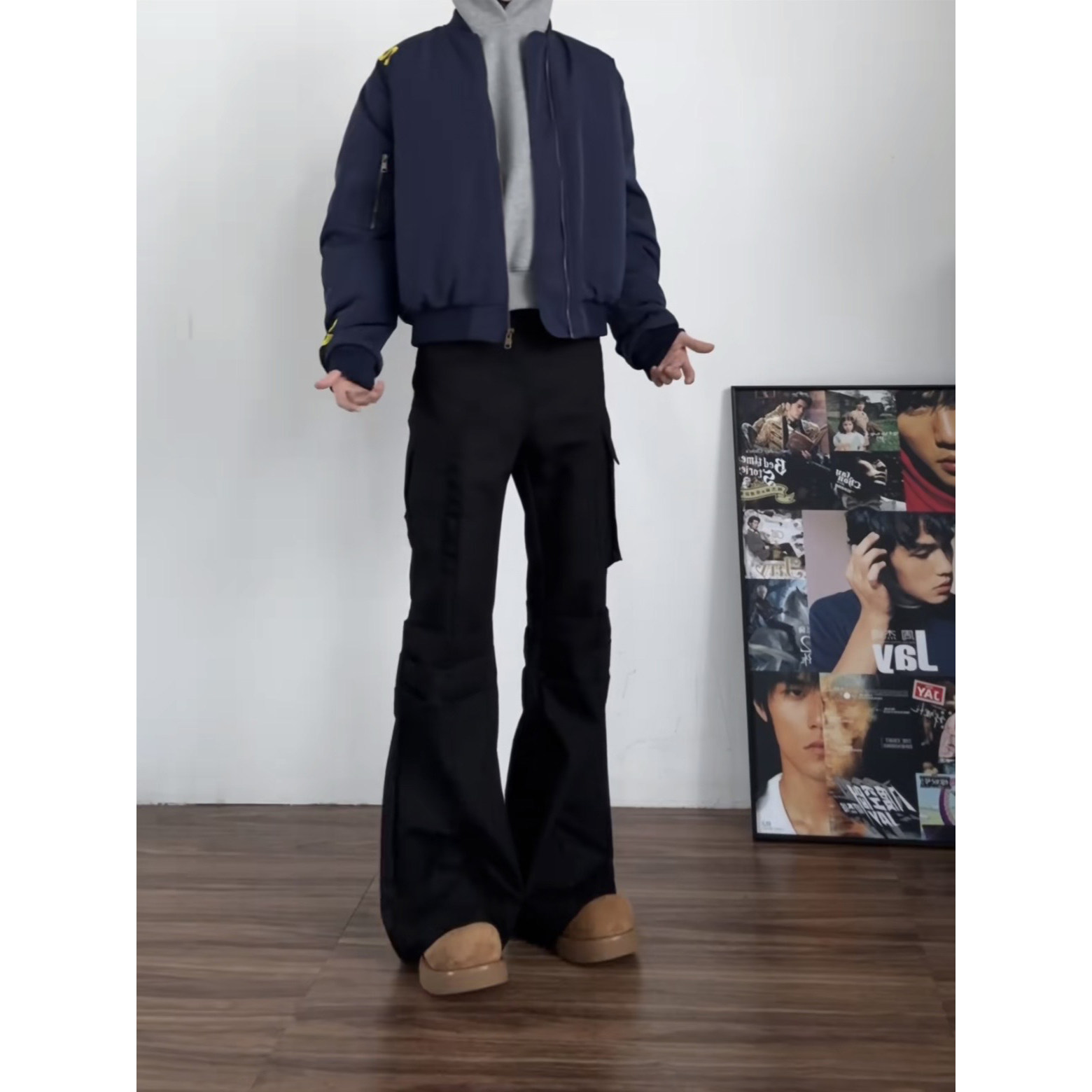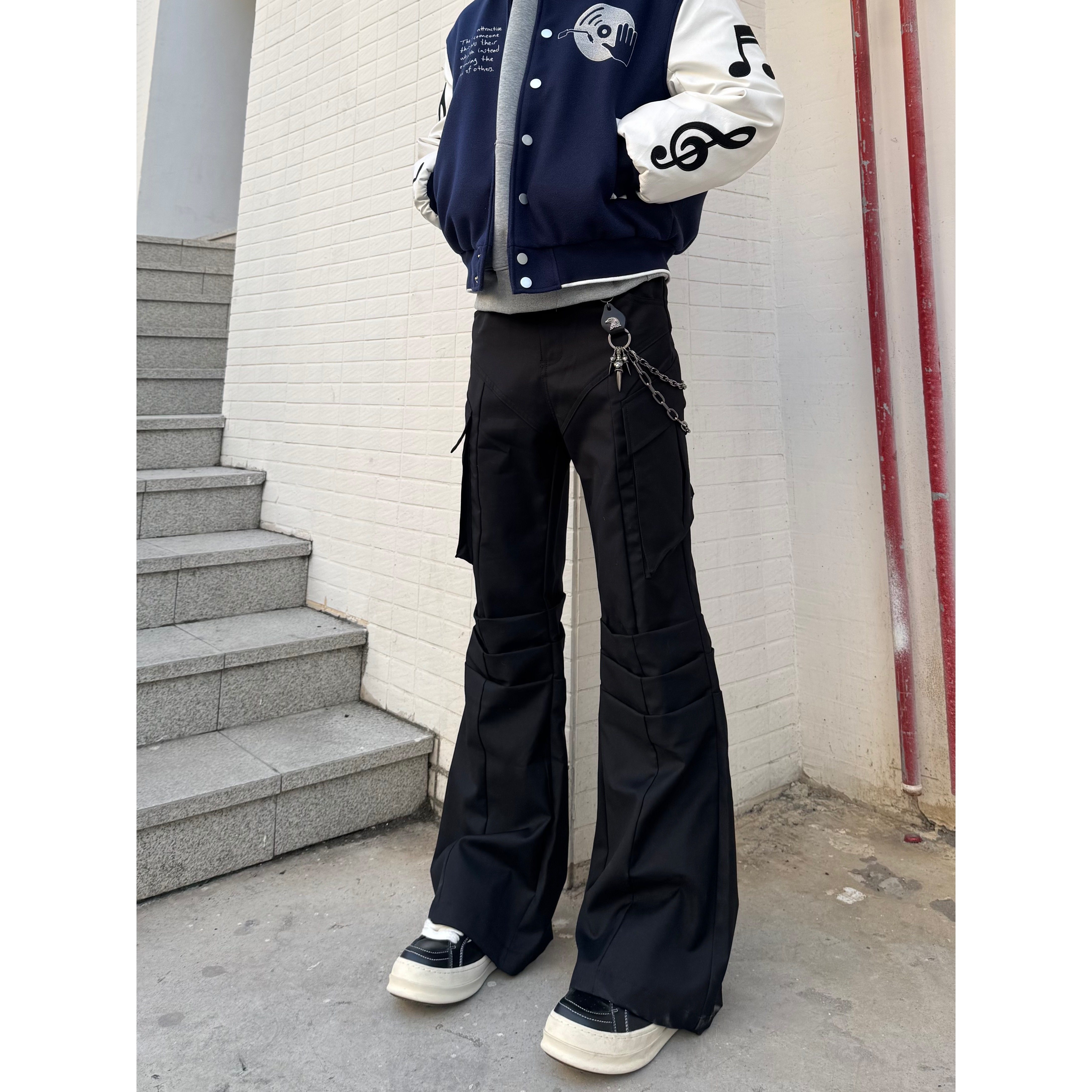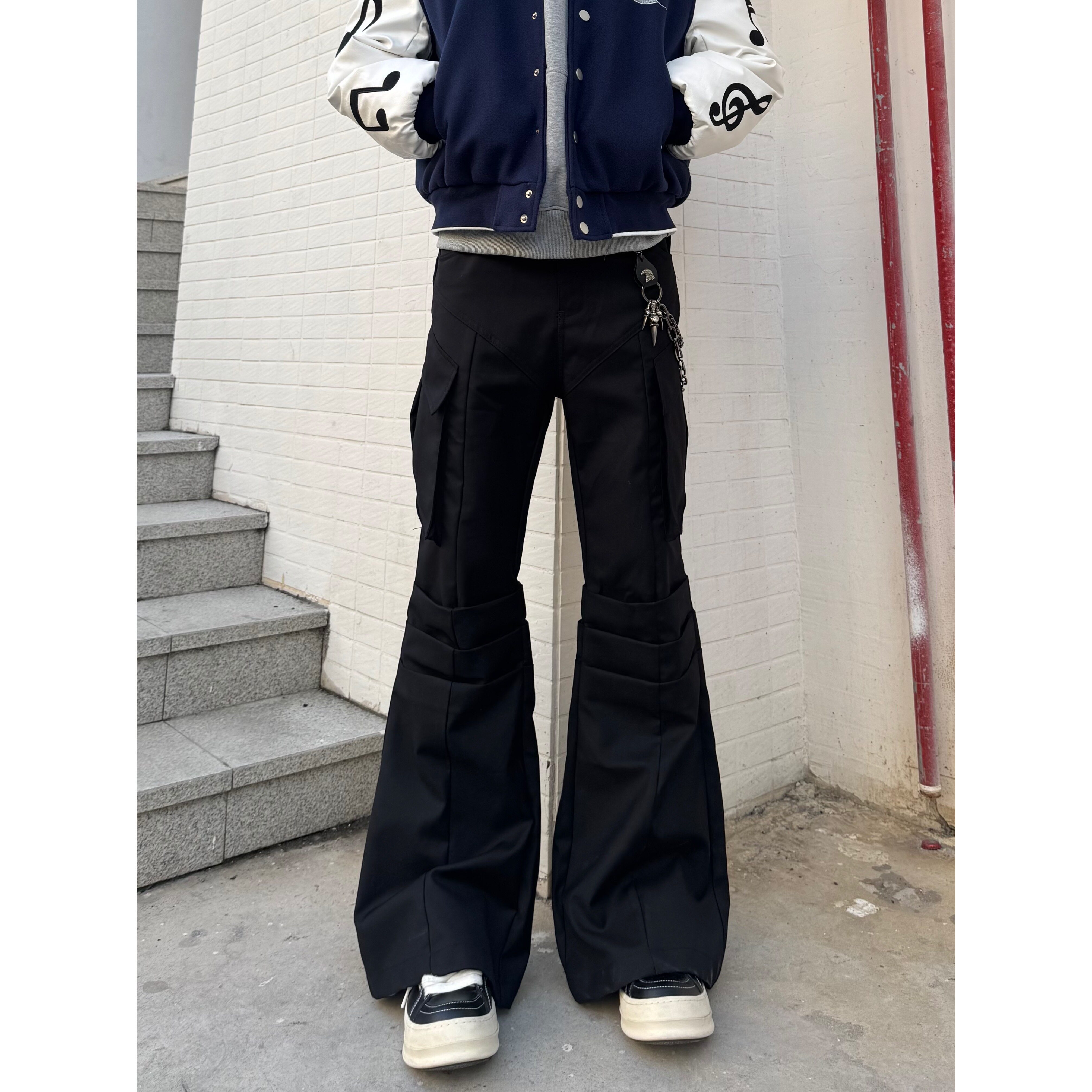 美式黑色微喇工装裤男cleanfit高街直筒阔腿喇叭裤子加长西裤秋季