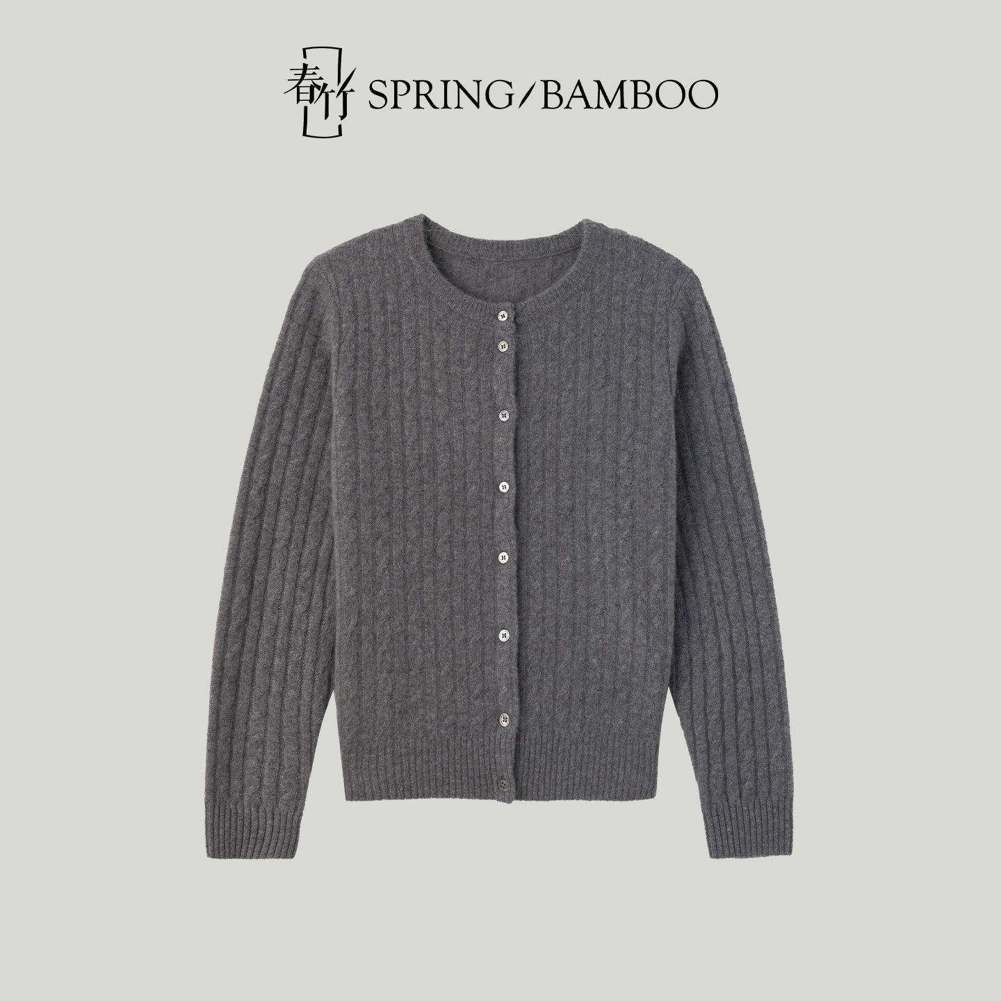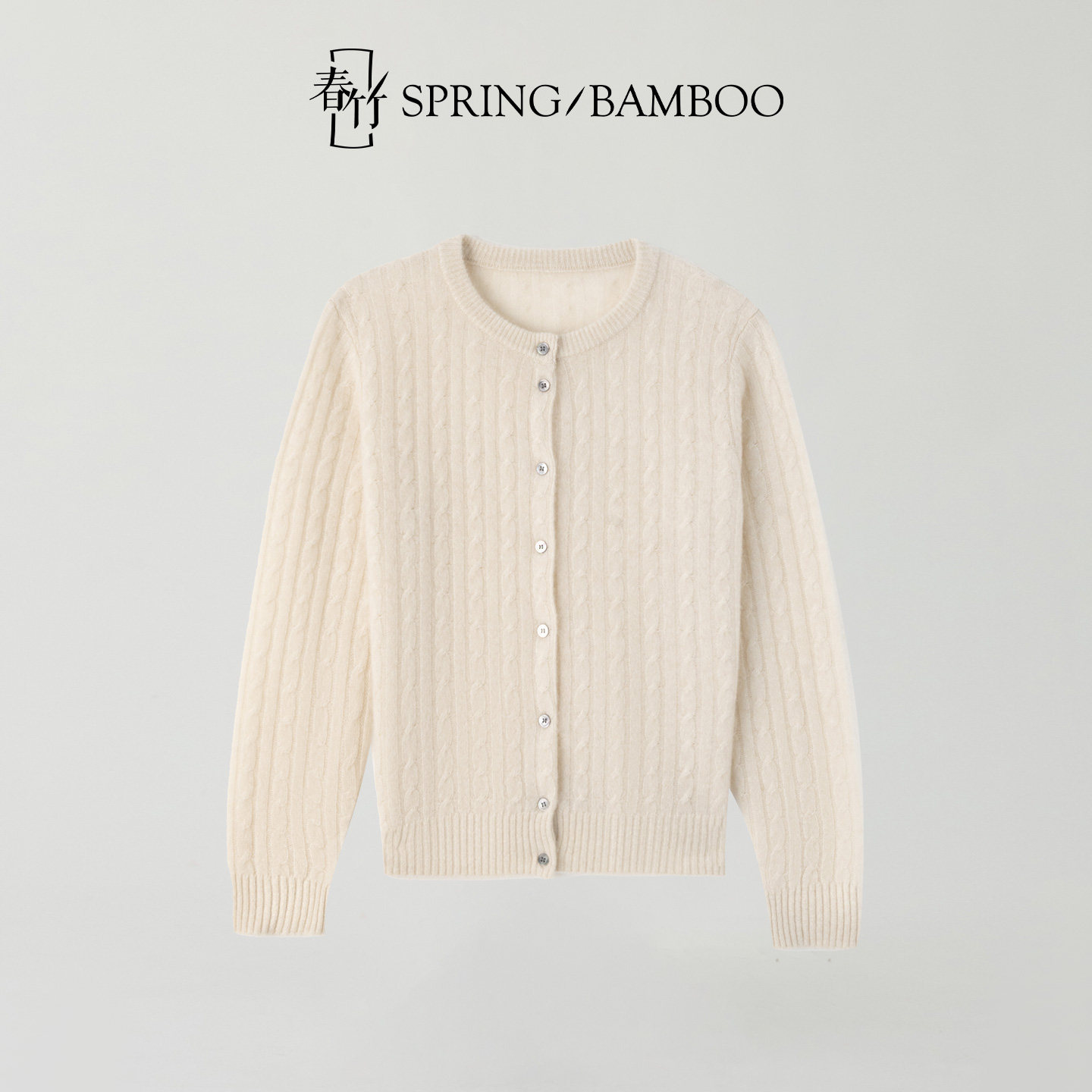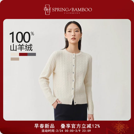春竹早春新款100%山羊绒圆领合体全身绞花轻盈长袖女士针织开衫