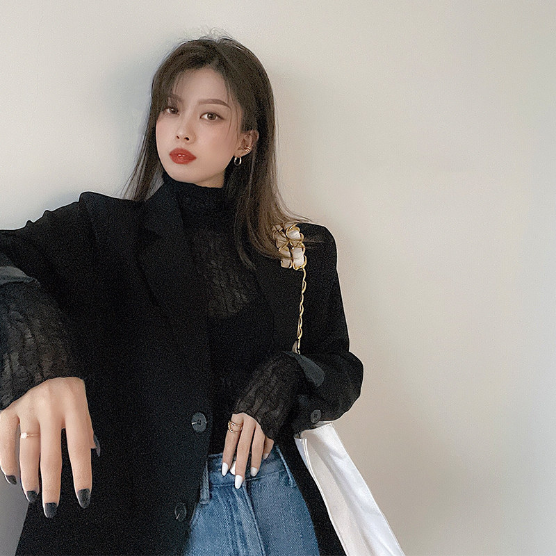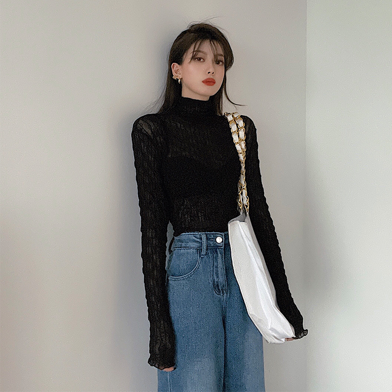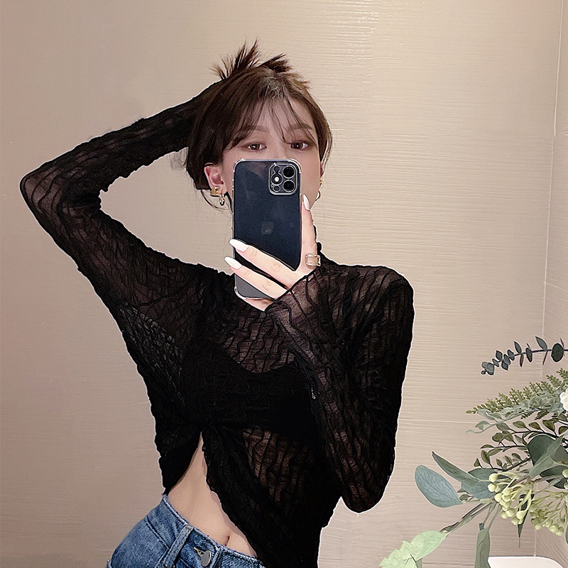 大码胖妹妹高领网纱内搭打底衫女春秋冬新款加绒蕾丝性感长袖上衣