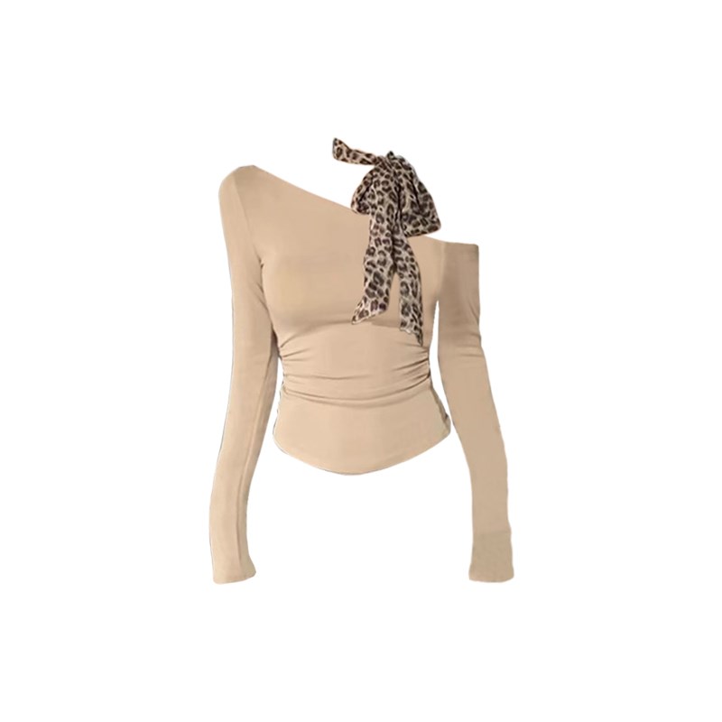 露肩复古甜辣小上衣女秋冬设计感气质斜肩长袖T恤豹纹丝巾打底衫