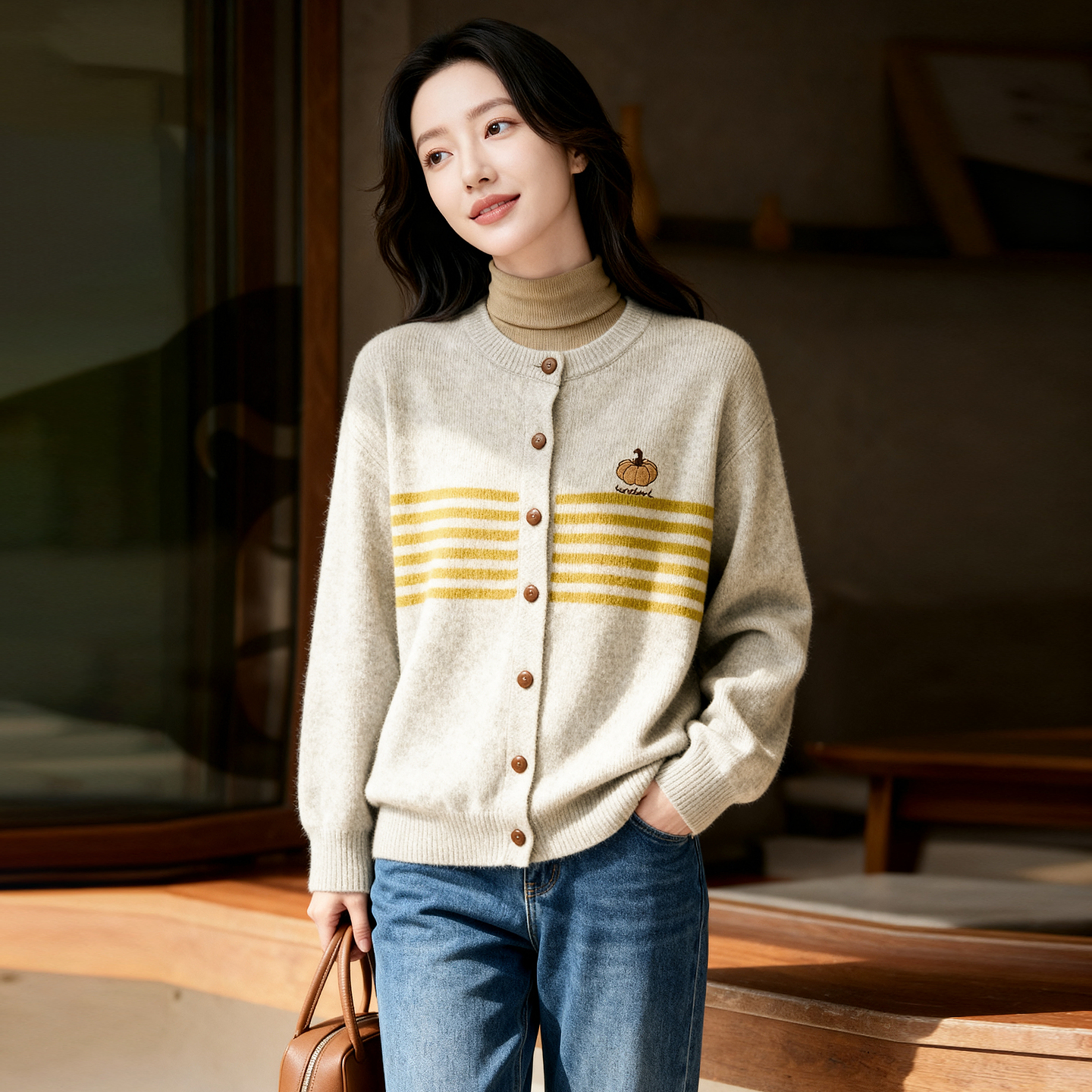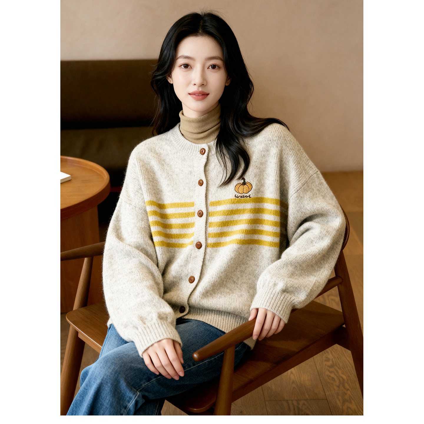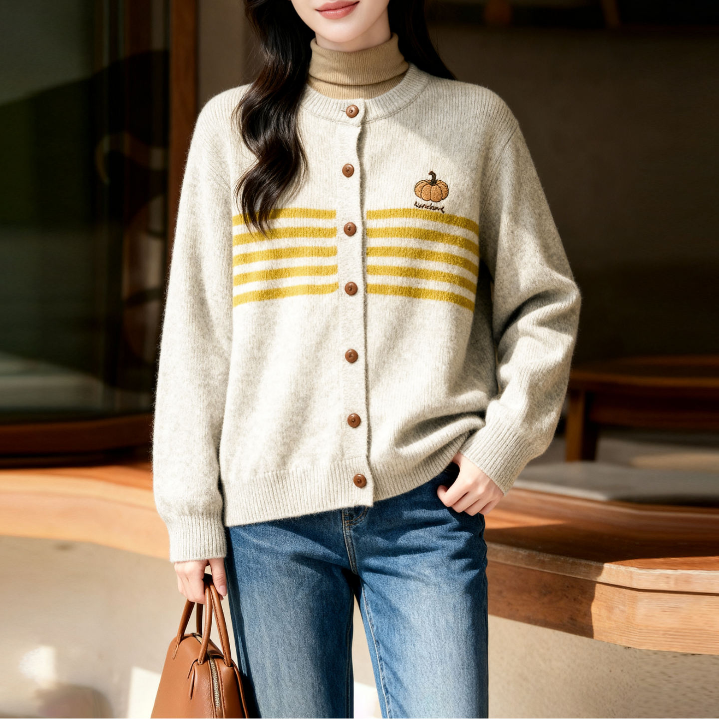 Basic House/百家好南瓜刺绣黄条纹单排扣圆领温柔风百搭毛衣外套