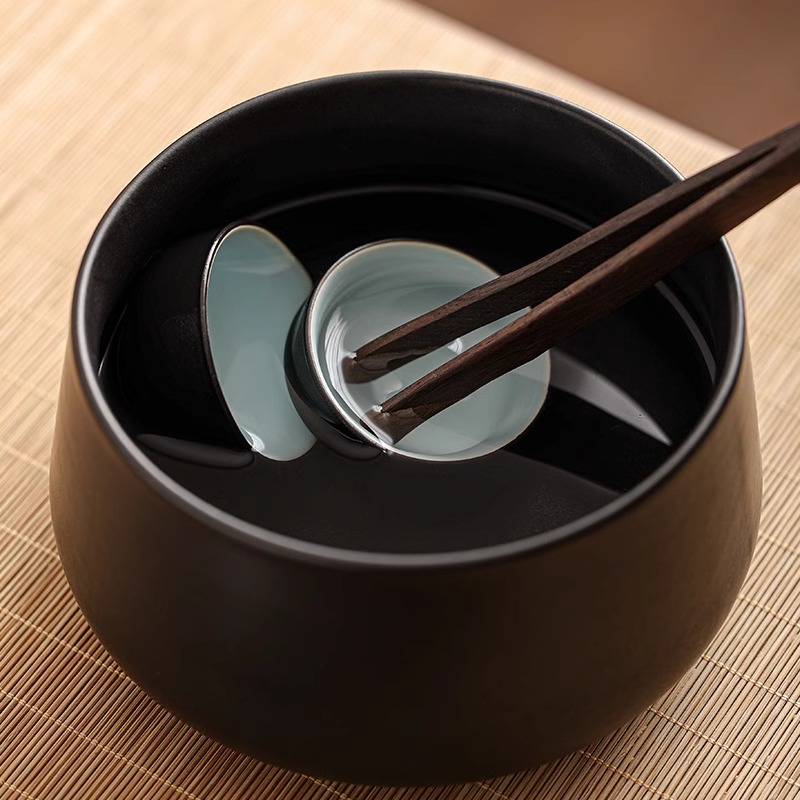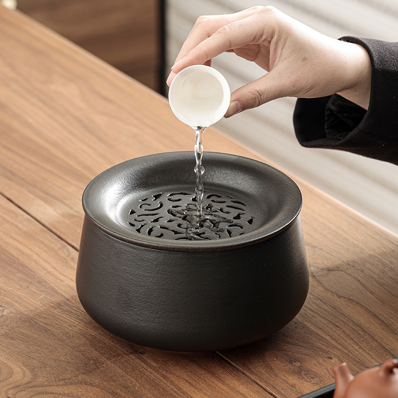 粗陶茶洗建水茶道配件家用大容量陶瓷茶杯洗茶渣缸带盖储茶废水桶