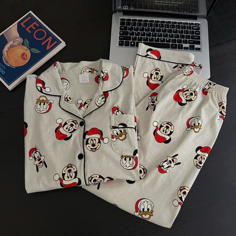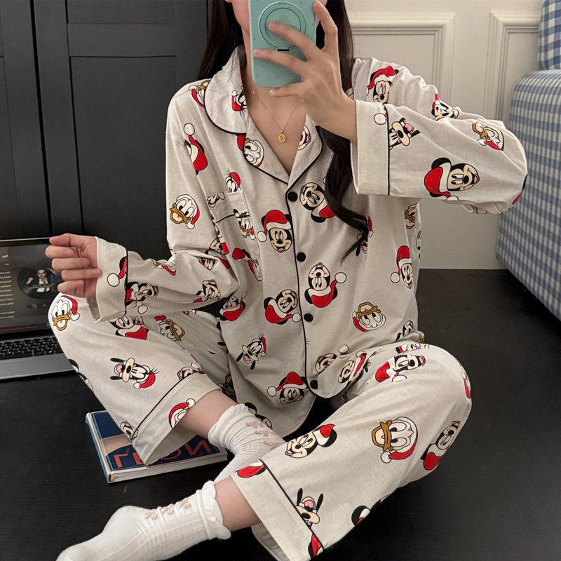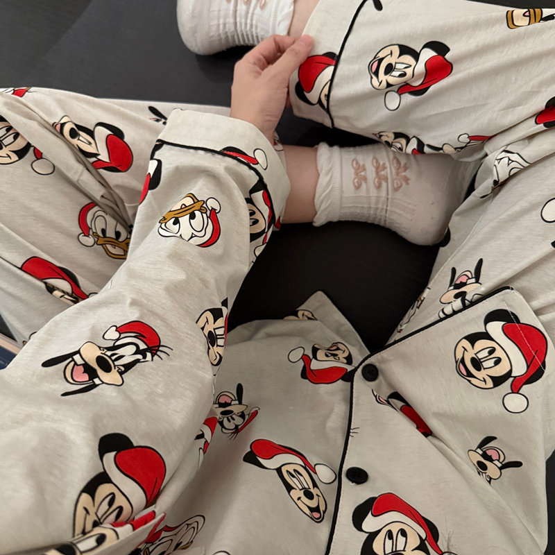 情侣睡衣春秋季长袖长裤纯棉卡通日系男女士圣诞米奇家居服套装