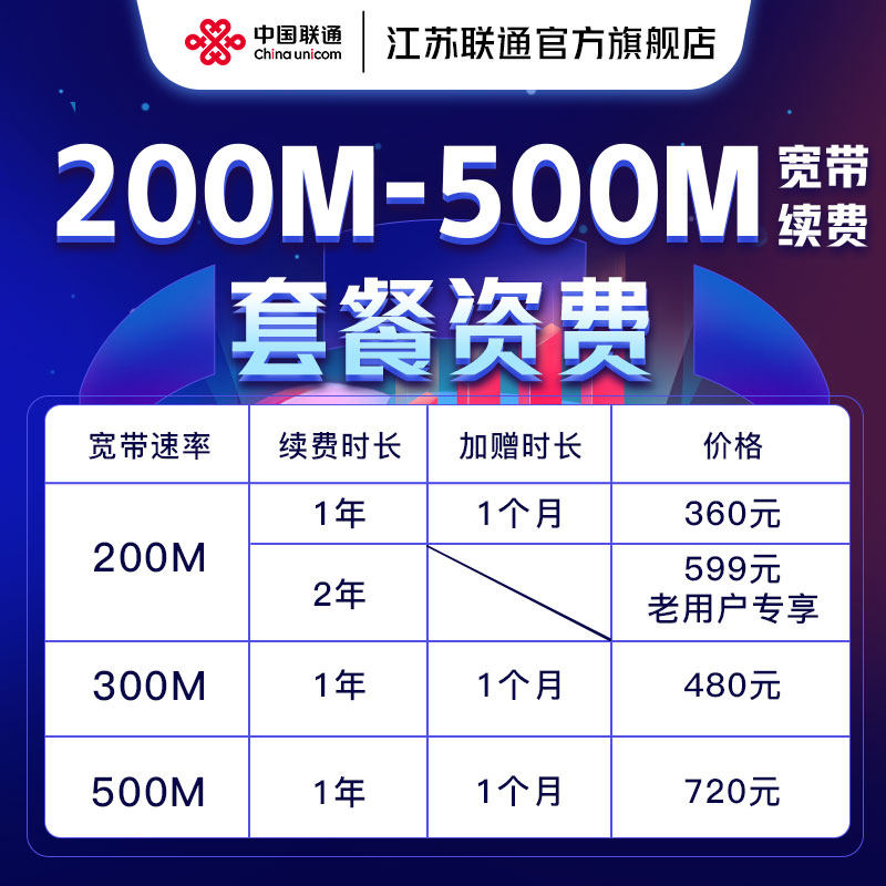 江苏联通宽带续费办理200M300M500M宽带套餐苏州南京无锡宽带续约
