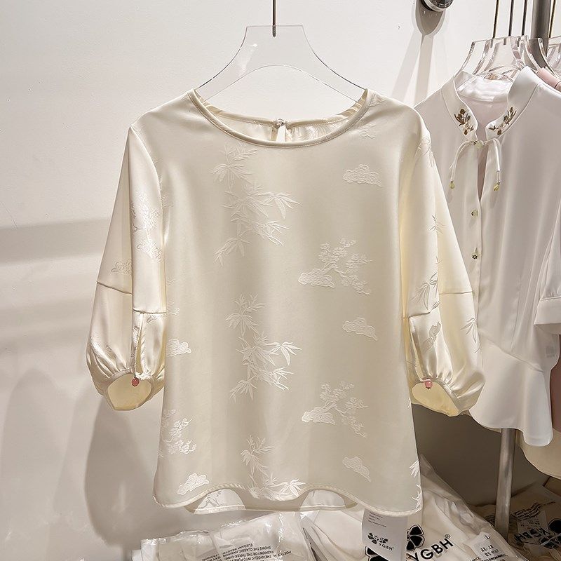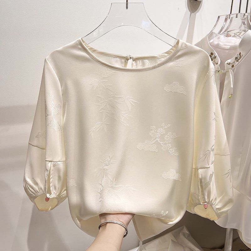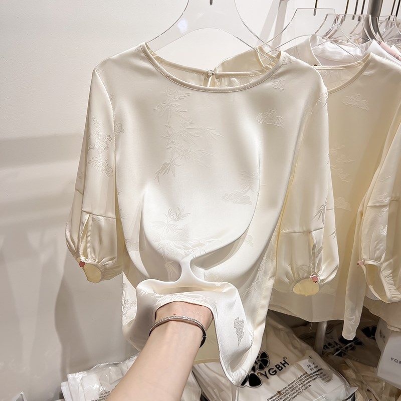 2024新款气质显瘦圆领浮雕国风灯笼袖五分袖雪纺衫女夏季薄款上衣