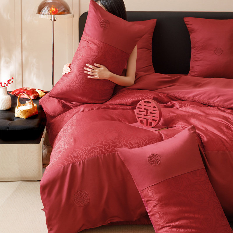 高档双喜刺绣结婚四件套红色喜庆被套纯棉床单简约新婚庆床上用品