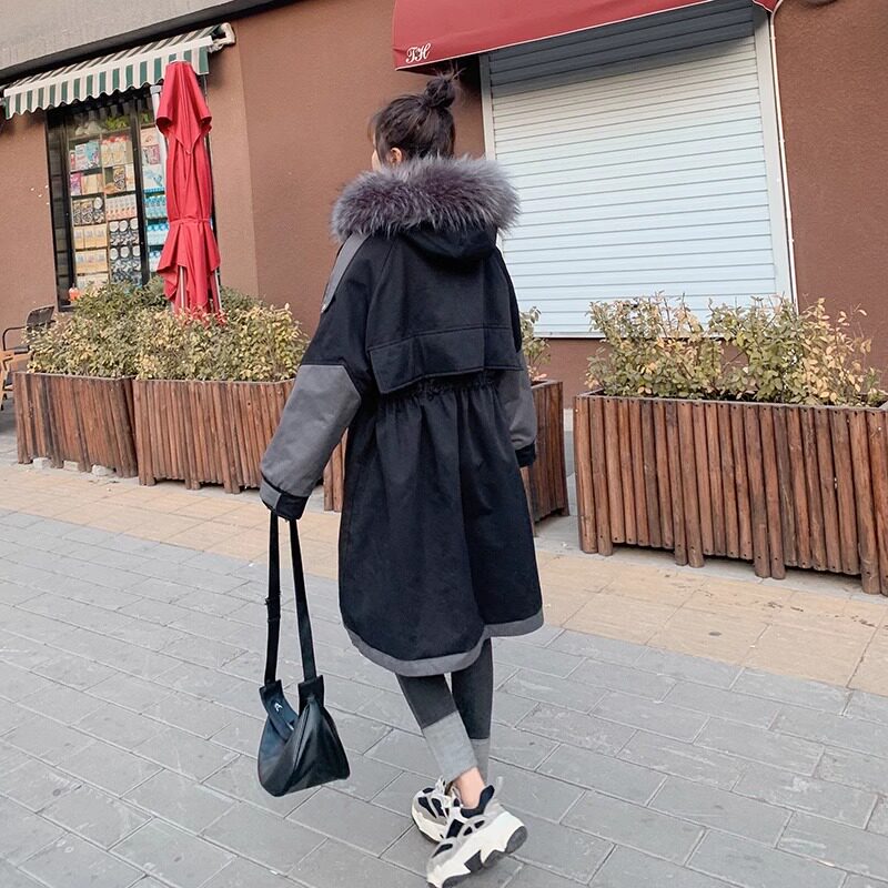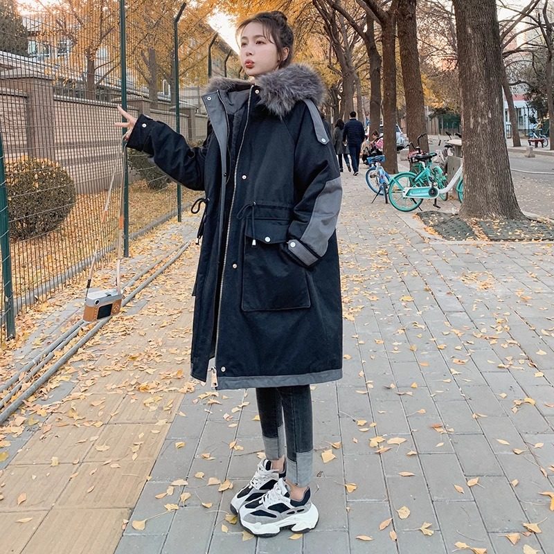 胖mm大码女装黑色工装派克服女中长款冬季新款加绒加厚棉衣外套潮