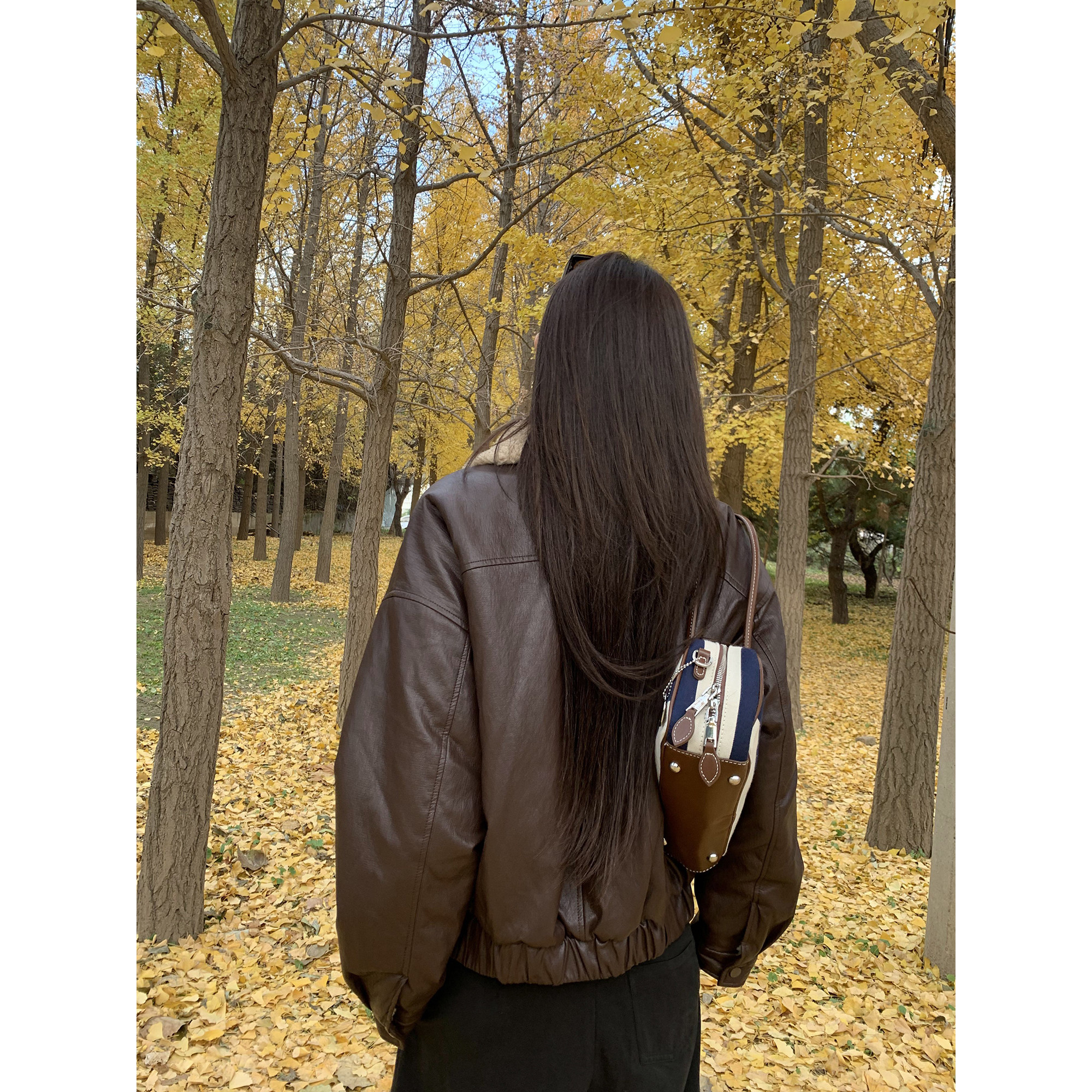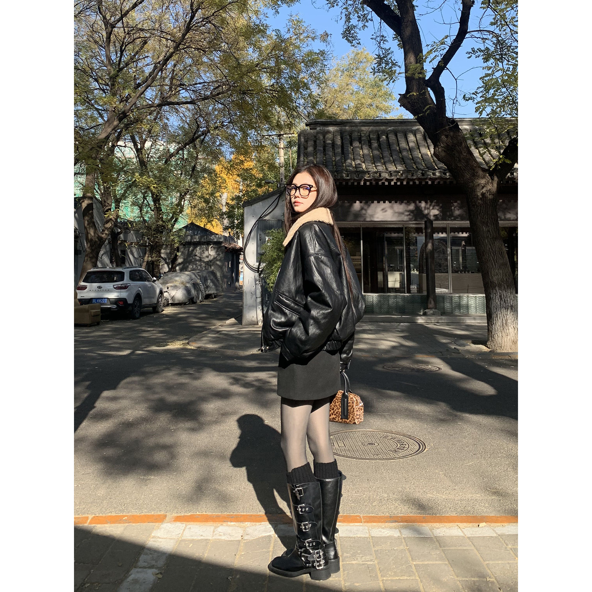 pusumede 曼哈顿 复古毛领拼接机车皮衣女高级感廓形翻领保暖外套