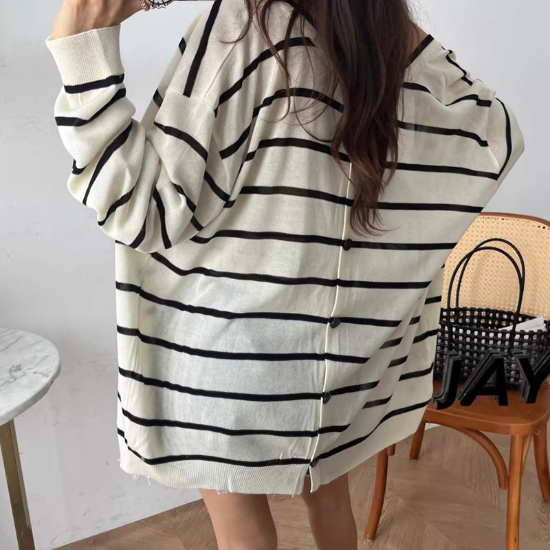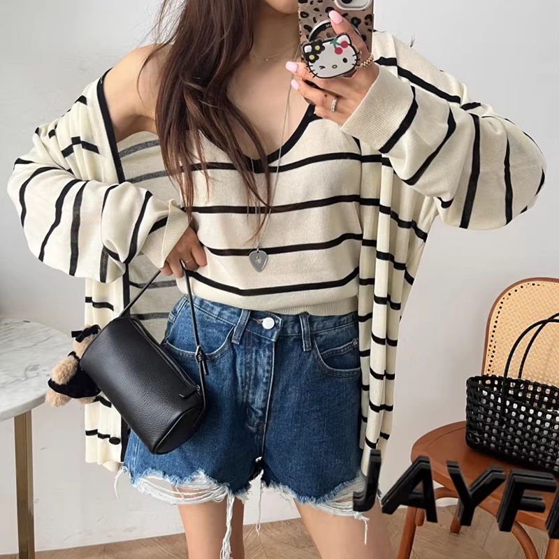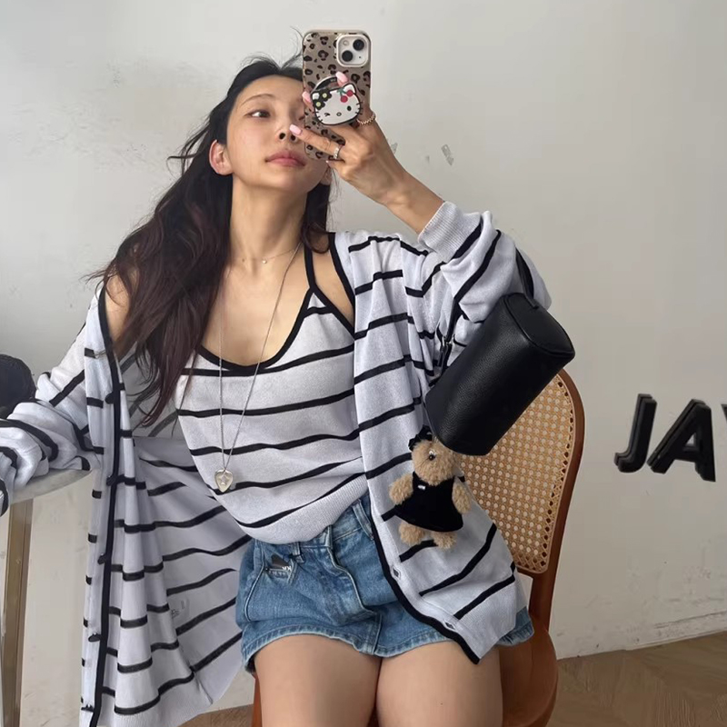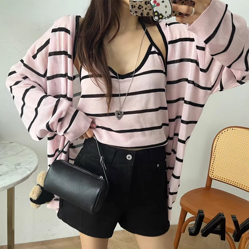 良良家慵懒风竖条纹防晒针织开衫外套女夏季新款小众内搭吊带背心