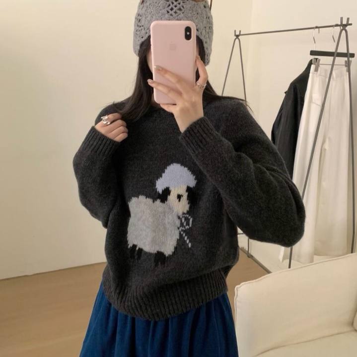 2025秋冬新款韩系卡通小羊提花翻领套头针织衫宽松百搭毛衣