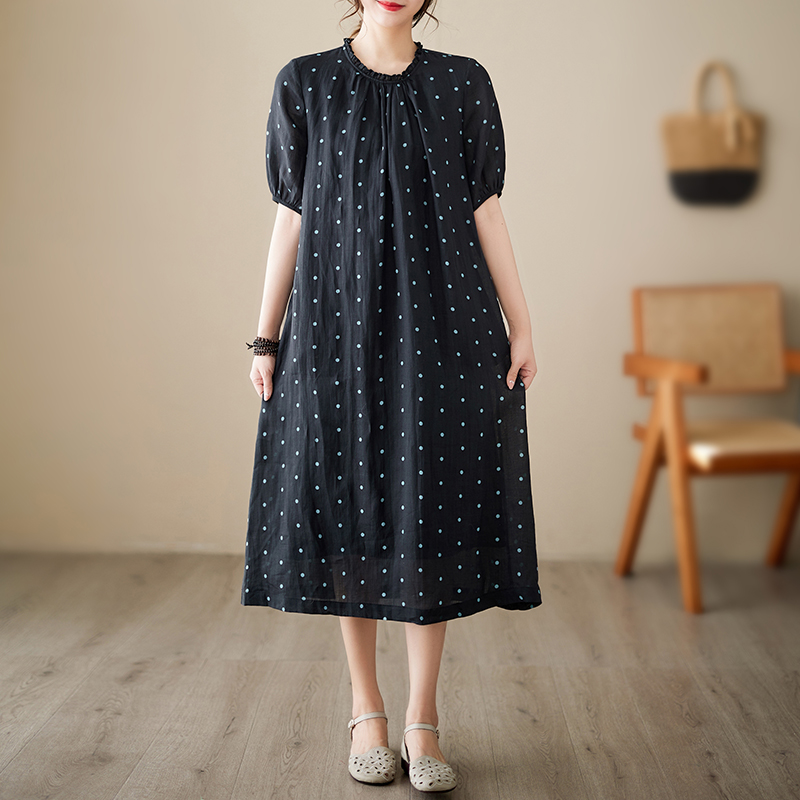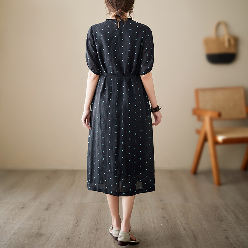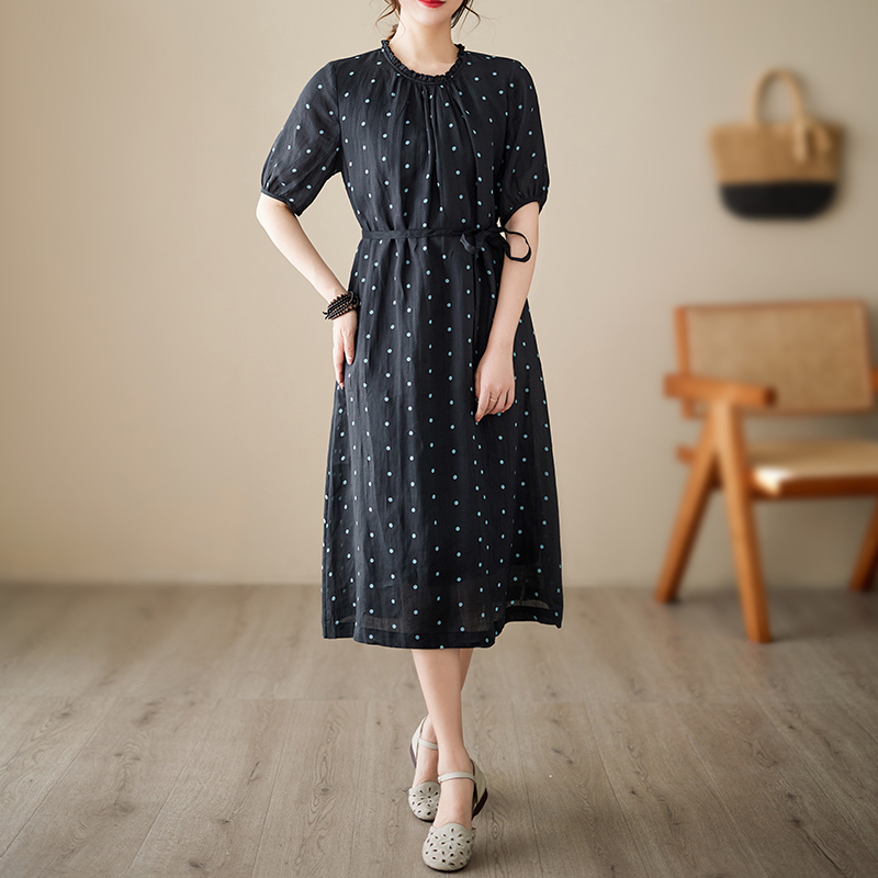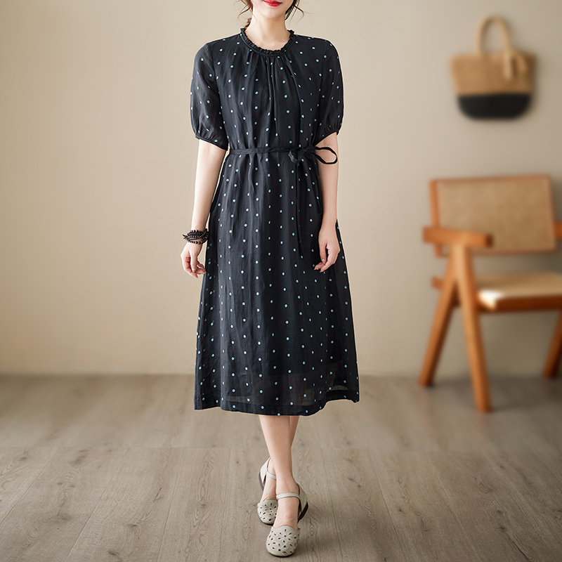 折扣夏季新款高端苎麻五分袖复古波点连衣裙女显瘦棉麻女裙子腰带