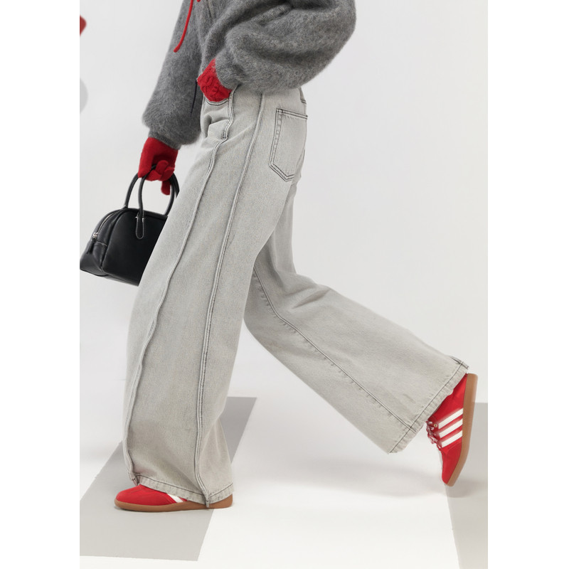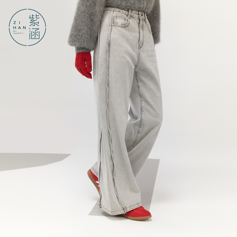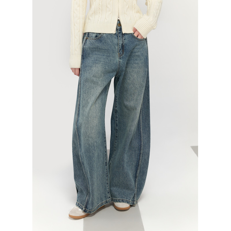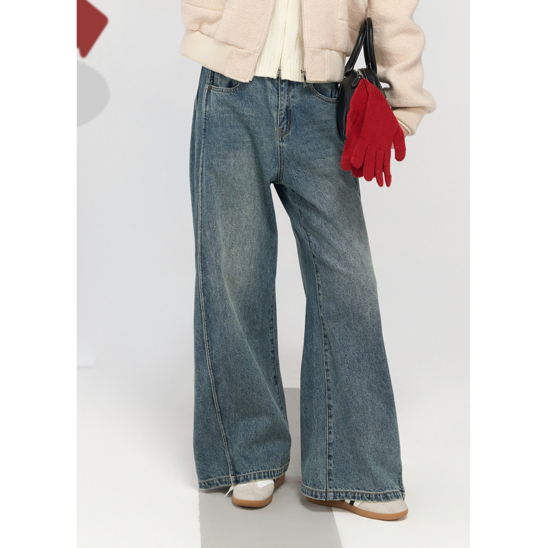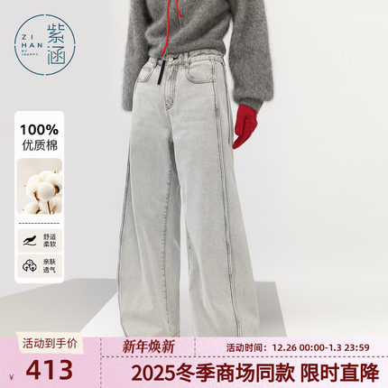 紫涵100%纯棉阔腿牛仔裤女冬季新款美式复古宽松休闲香蕉裤休闲裤