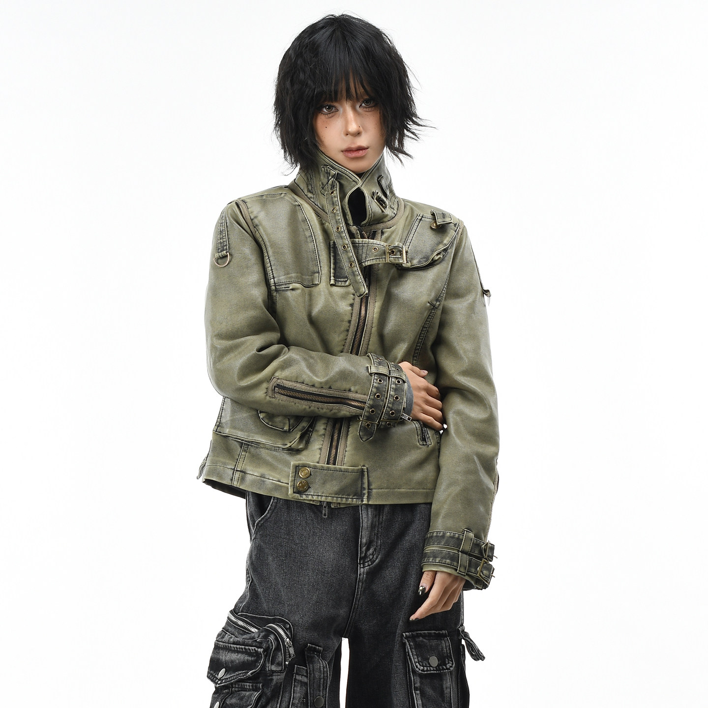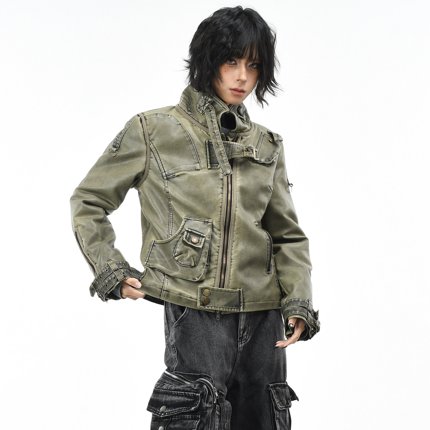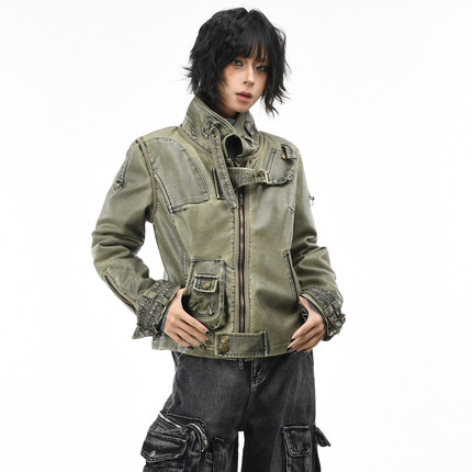 OV原创美式朋克风立领夹棉工装棉服女冬季铆钉做旧PU皮衣外套短款