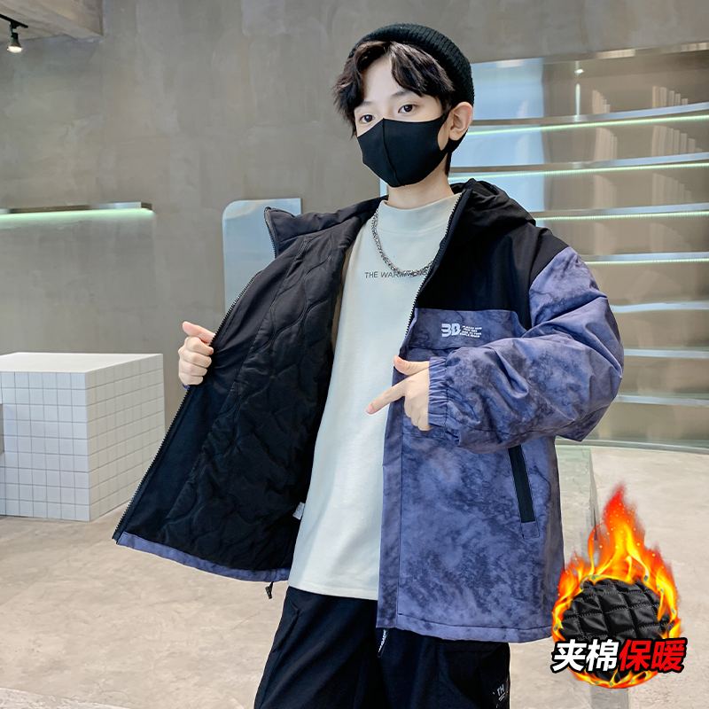 男童秋冬夹棉外套洋气儿童冬装加绒加厚风衣中大童春秋连帽夹克潮