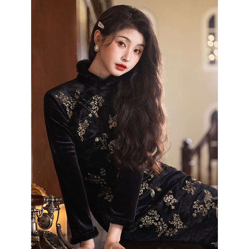 黑色旗袍2025新款高端修身秋冬季长袖加绒加厚改良刺绣复古民国风