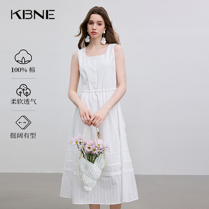 KBNE白色连衣裙女100%棉显瘦裙2025夏季新款欧若风纹刺绣长裙女装