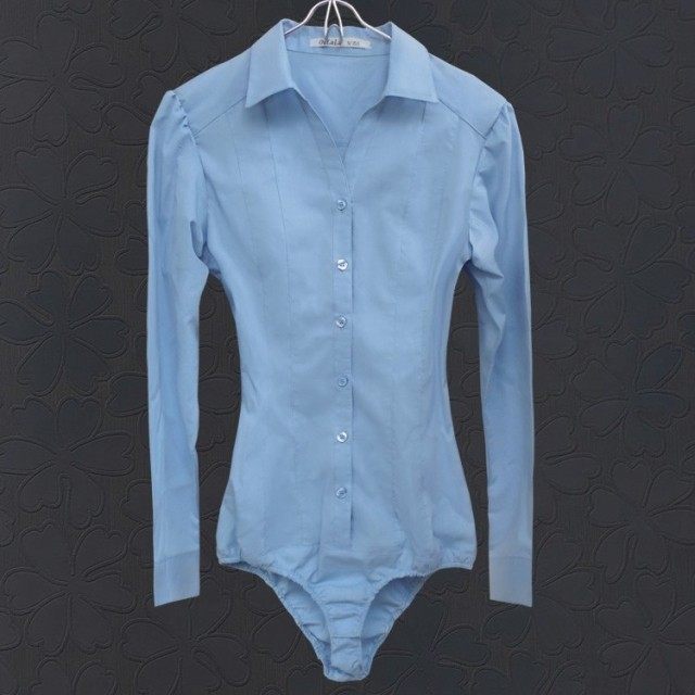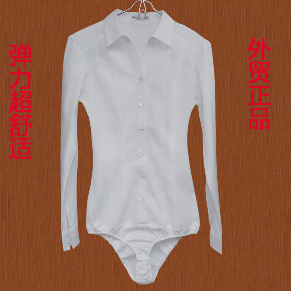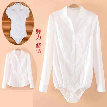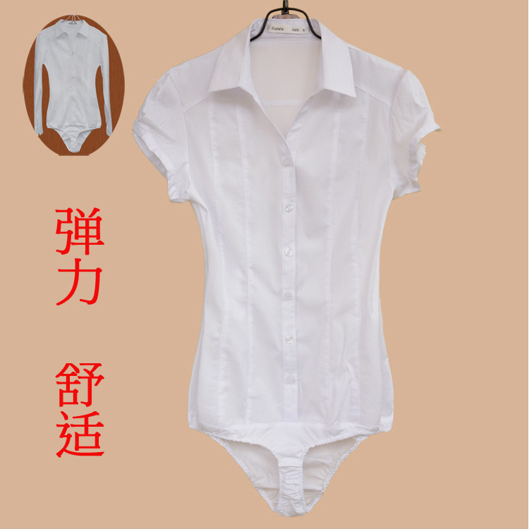 模特演出 长袖弹力连体衬衫女短袖修身上衣职业装显瘦V领大码白色