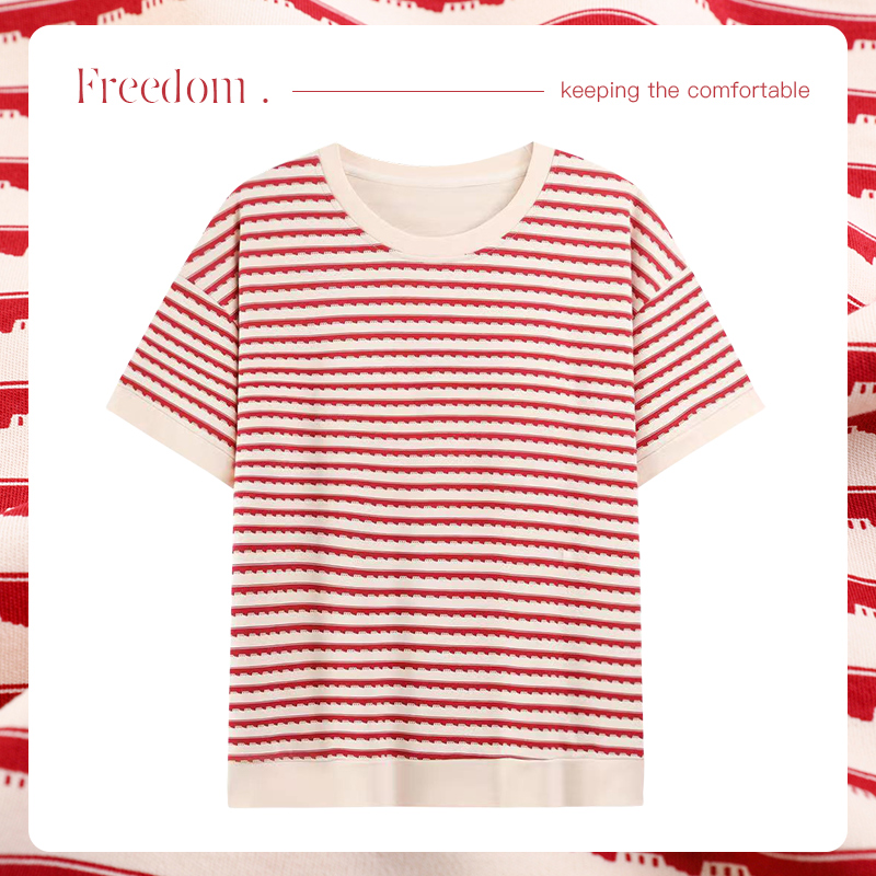 带胸垫单件上衣睡衣女夏季短袖纯棉条纹套头休闲宽松衬衫家居服