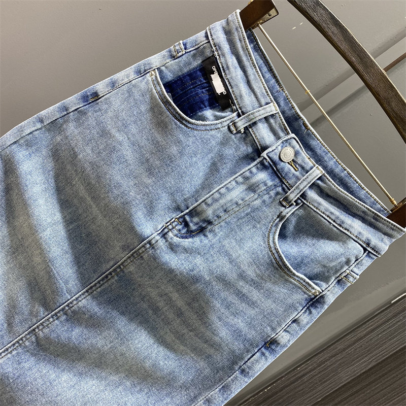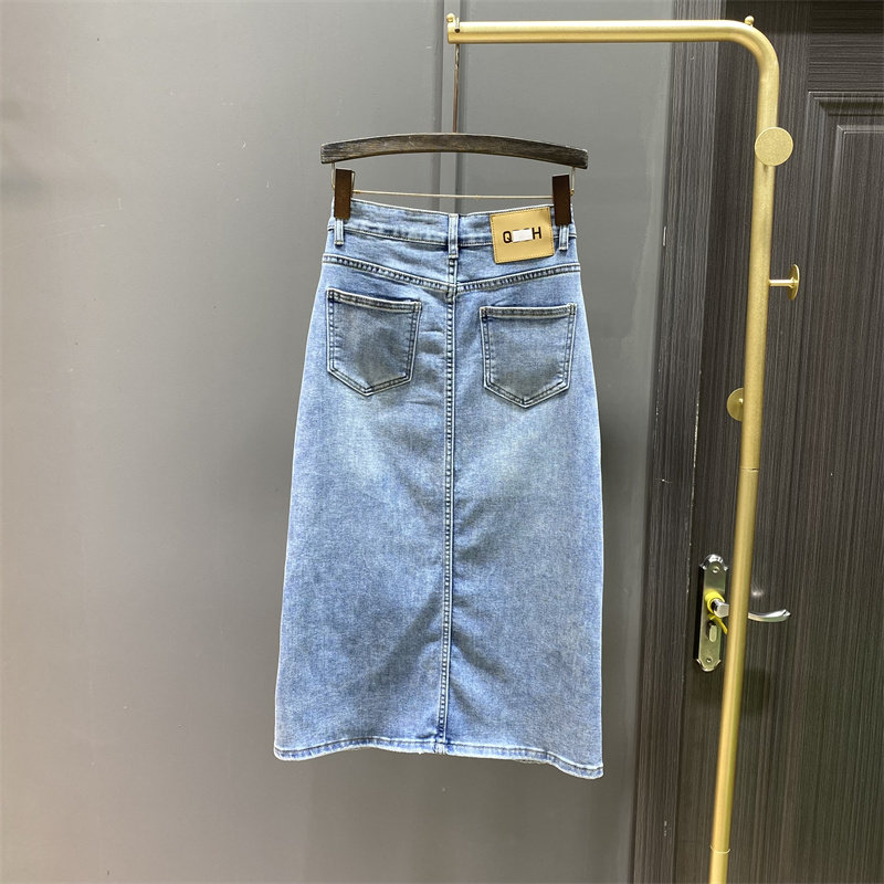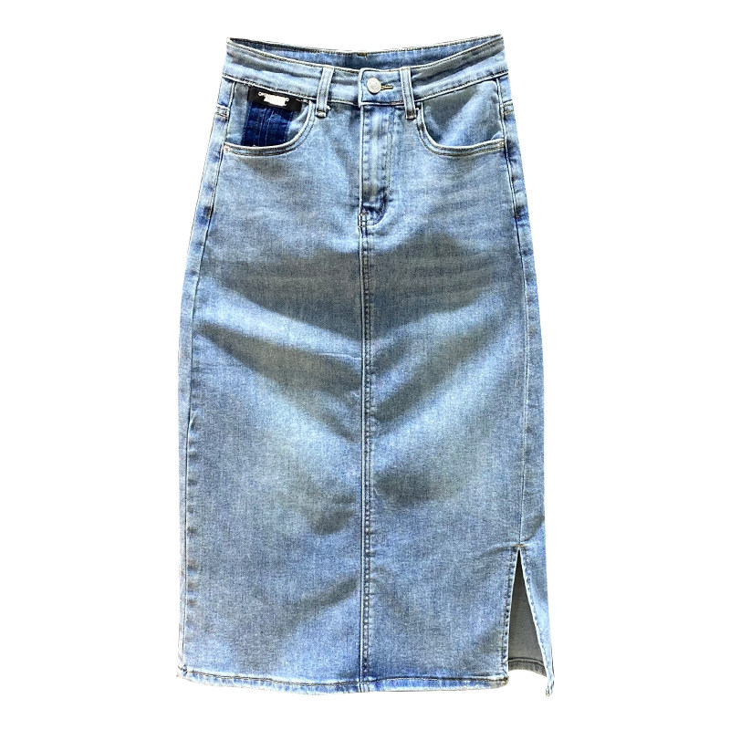 高腰侧开叉牛仔半身裙女春夏2026新款撞色口袋中长款一步包臀裙子