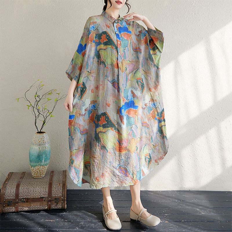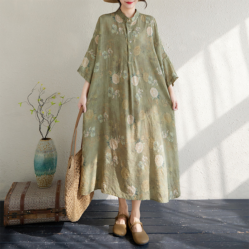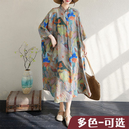 200斤季新款气质文艺复古棉麻印花立领宽松超长大码度假连衣裙