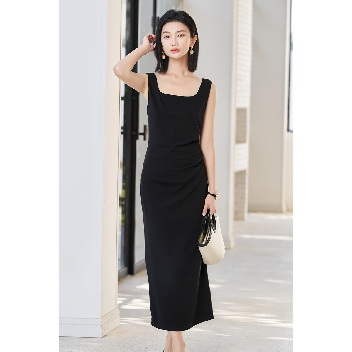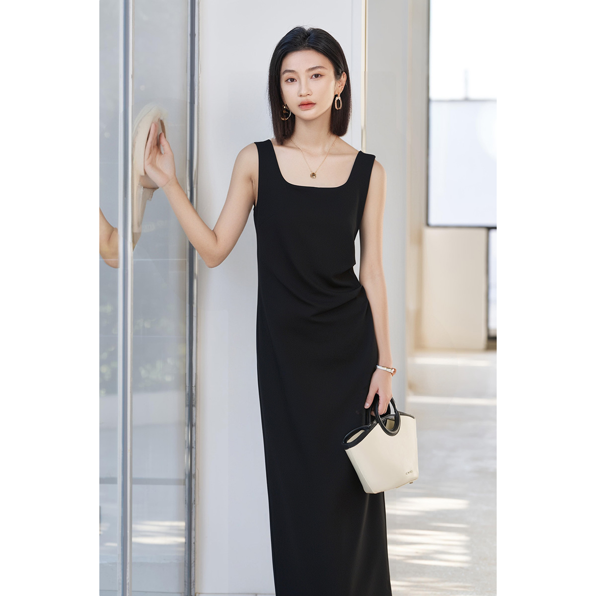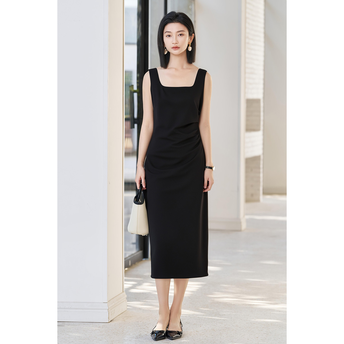 米思阳2025秋季新款气质通勤收腰背心裙简约方领无袖连衣裙女5638