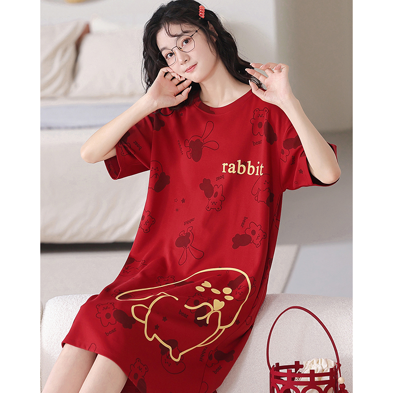睡裙女夏季短袖纯棉公主套头2022年新款夏款红色睡衣裙薄款本命年