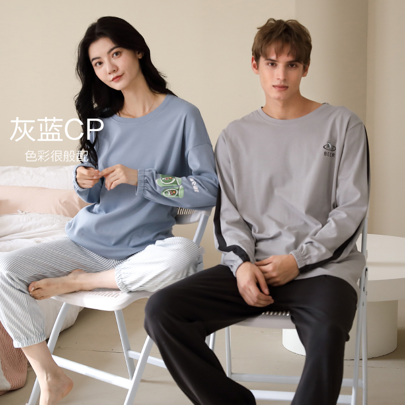 情侣睡衣女秋款福音棉简约长袖条纹男士大码春秋季薄款家居服套装