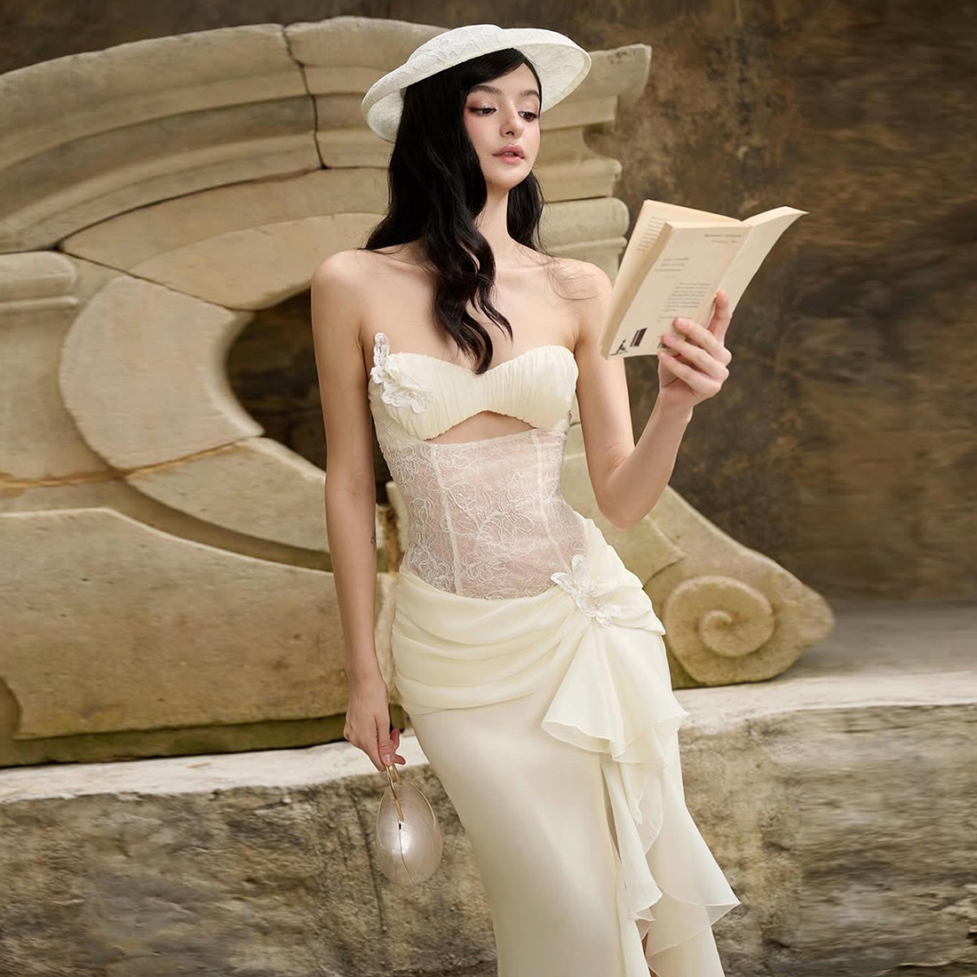 蕾丝镂空显瘦抹胸连衣裙开叉长裙
