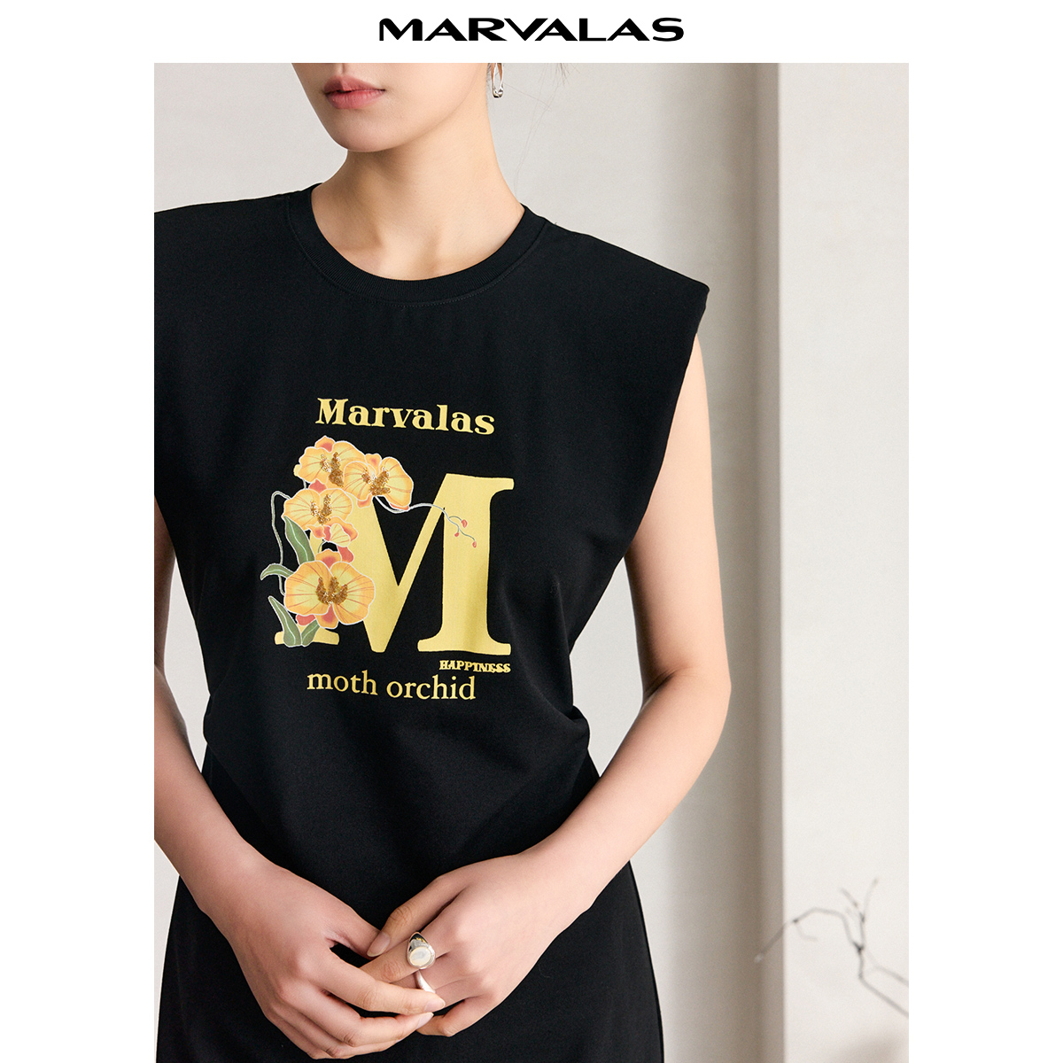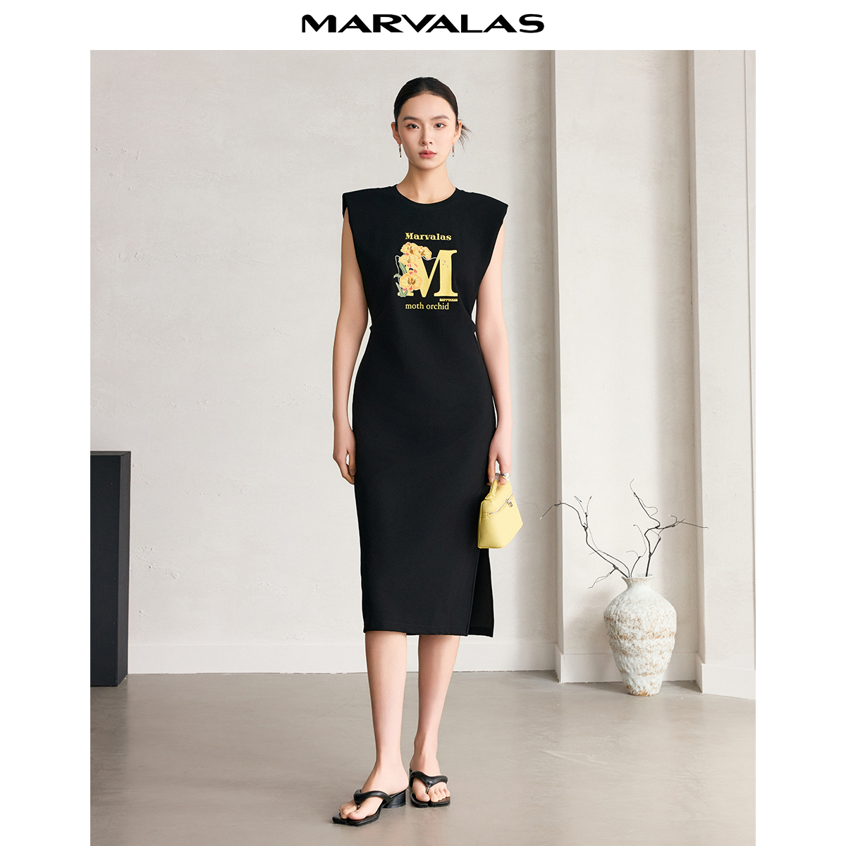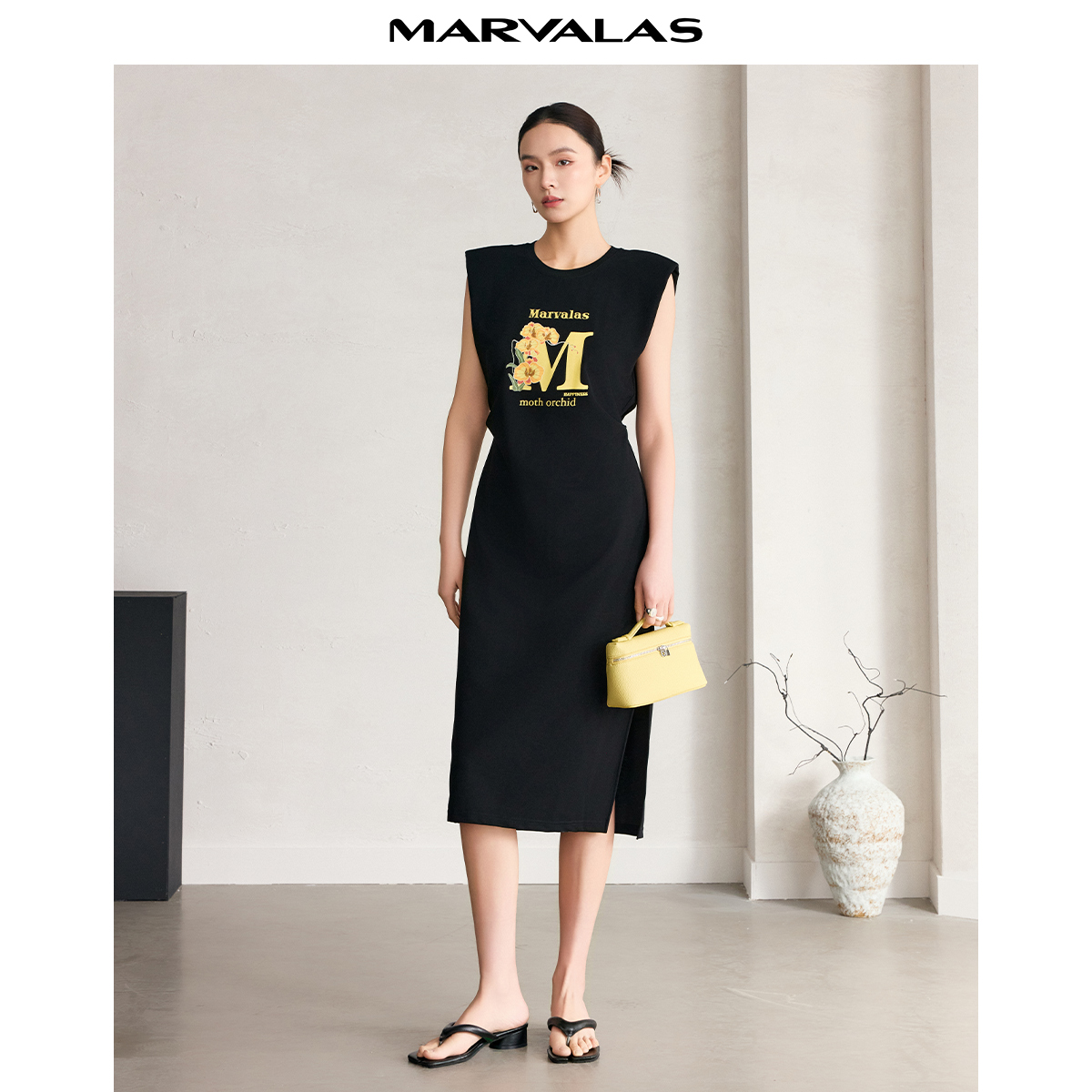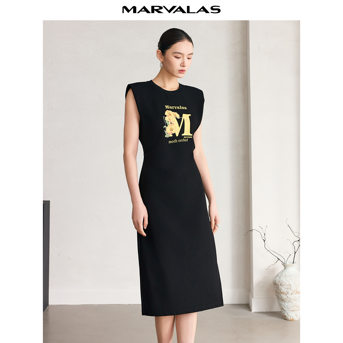 曼德诗时尚印花连衣裙2025夏季新款弹力收腰设计无袖冰丝针织长裙