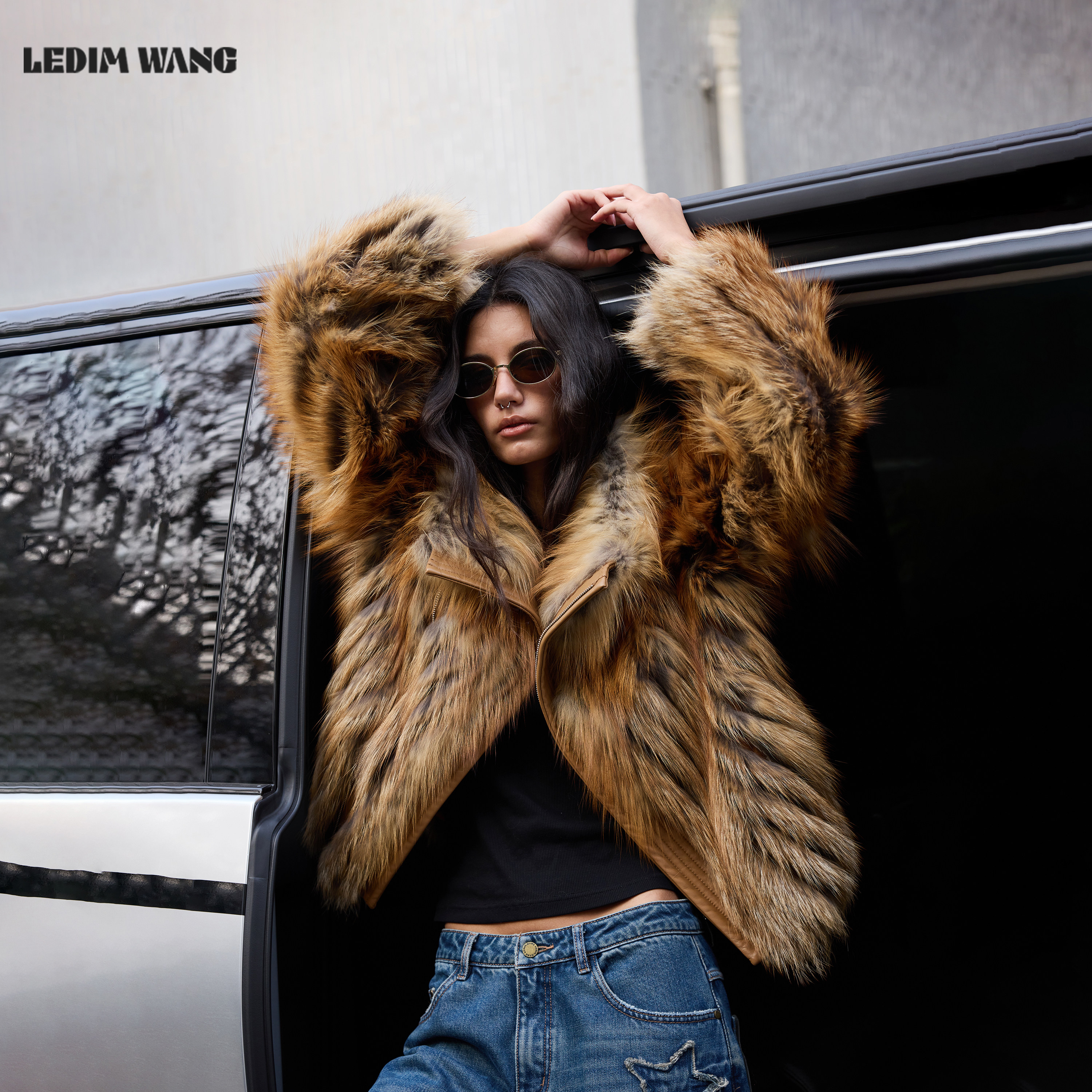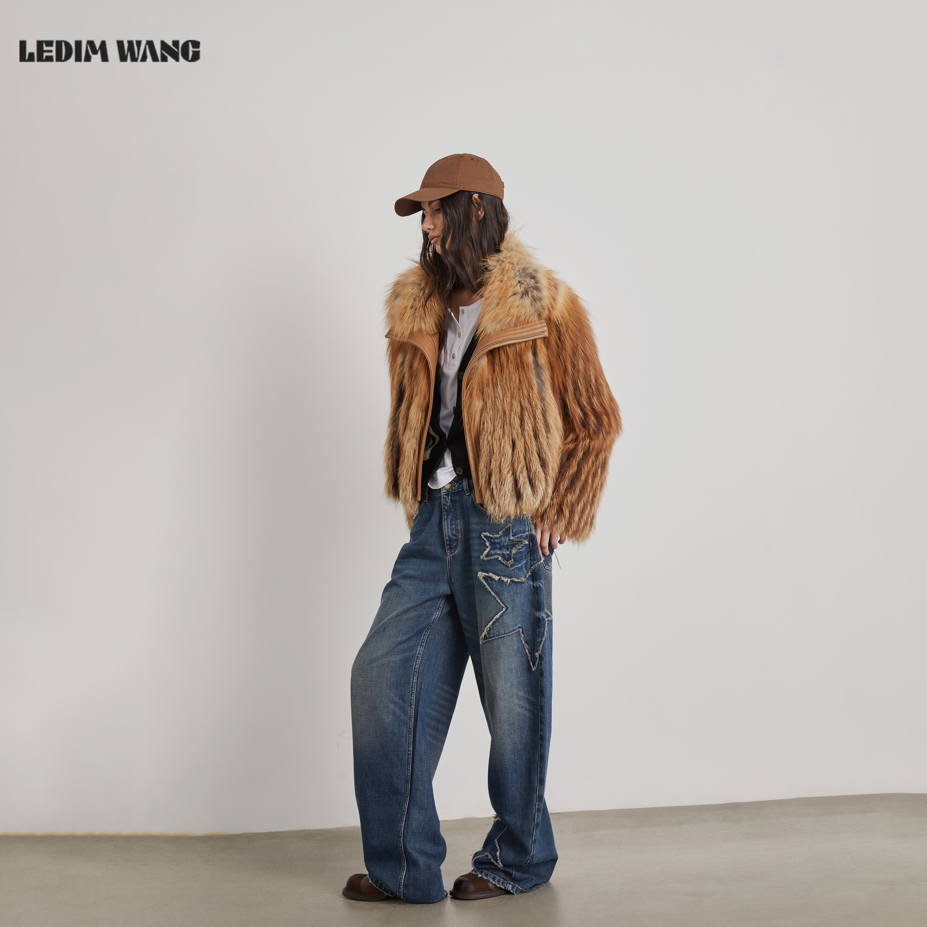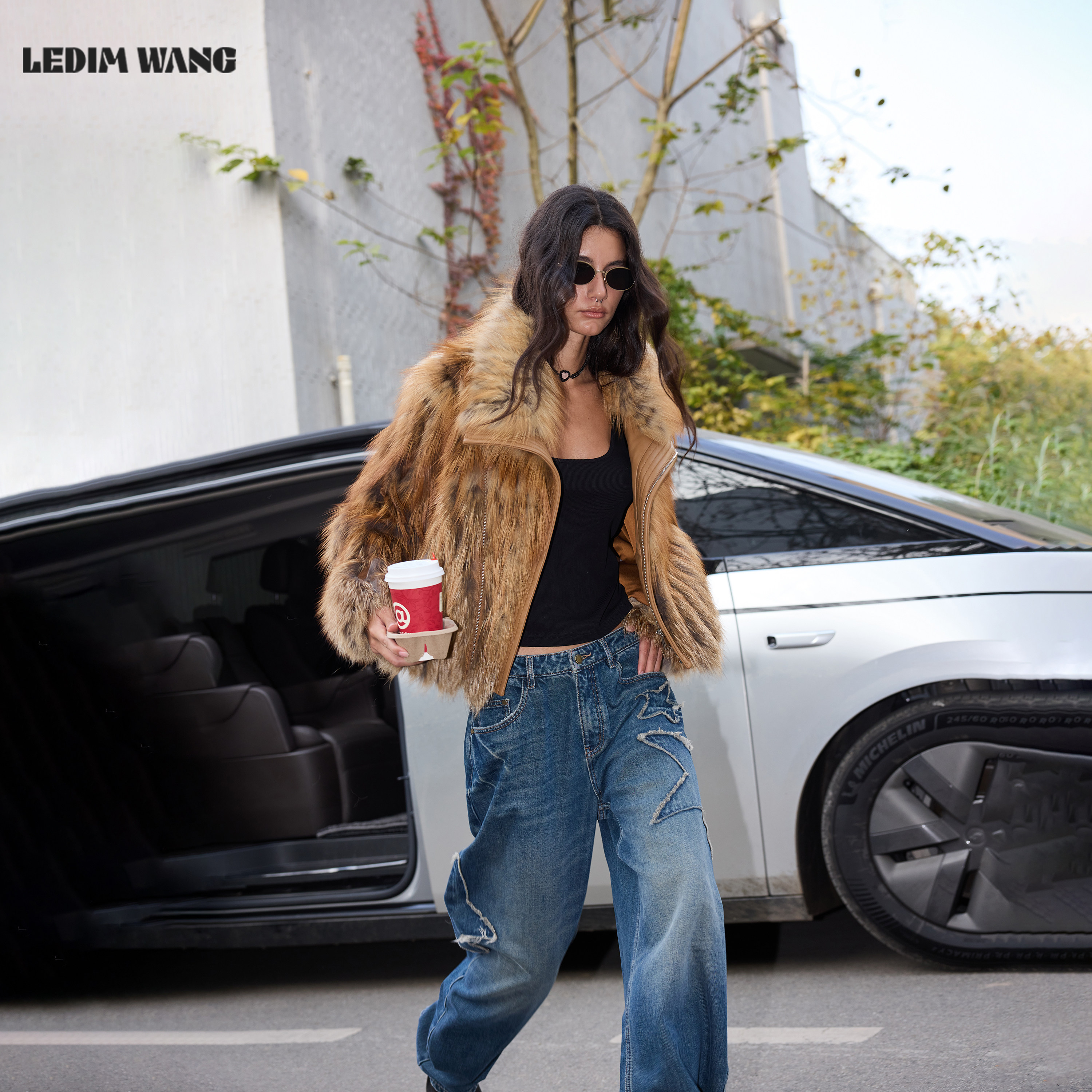 LEDIM WANG芬兰进口sagafurs红狐狸毛皮草外套女短款金棕色翻领