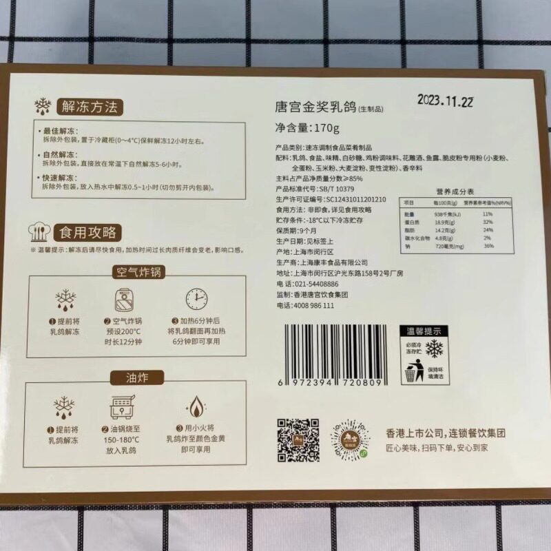 唐宫金奖乳鸽170g*3袋